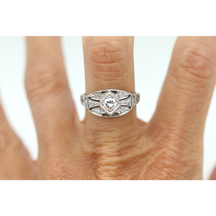 The Thelma ring is an authentic vintage engagement ring from the Edwardian era, circa 1920s. This ring features a .30 carat transitional cut diamond of G color and VS2 clarity, residing in a two tiered geometric four sided frame. The diamond is surrounded by six (6) old mine cut diamond accents. Beautifully crafted in platinum, accentuated with open metal work and delicate milgrain engravings. A stunning Edwardian jewel! In very good condition.