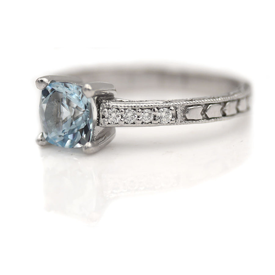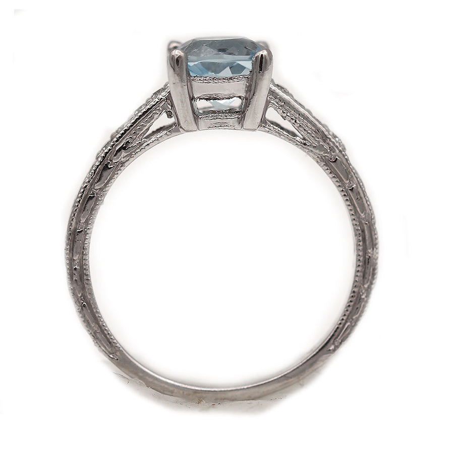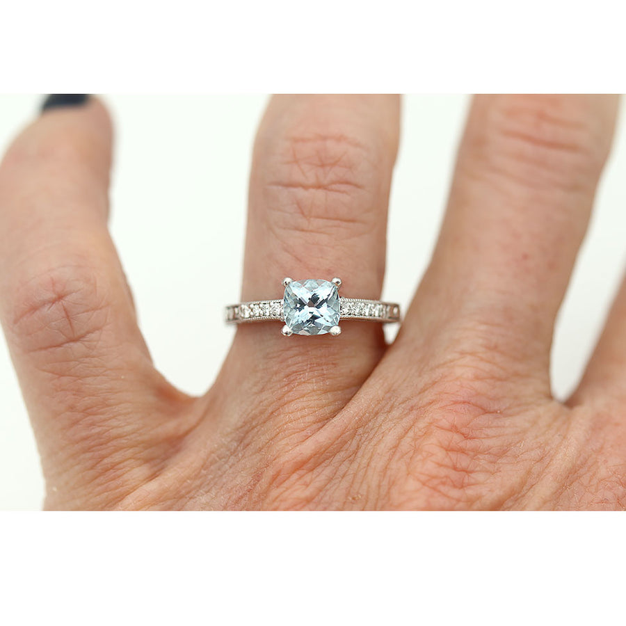 The Milatta ring is an authentic estate aquamarine engagement ring, circa 1980's. This ring features a natural placid blue, .95 carat cushion cut aquamarine, flanked by eight (8) shoulder set round cut diamond accents. Beautifully crafted in platinum, and accentuated with delicate milgrain and filigree engravings. The perfect alternative engagement ring! This ring is in very good condition.