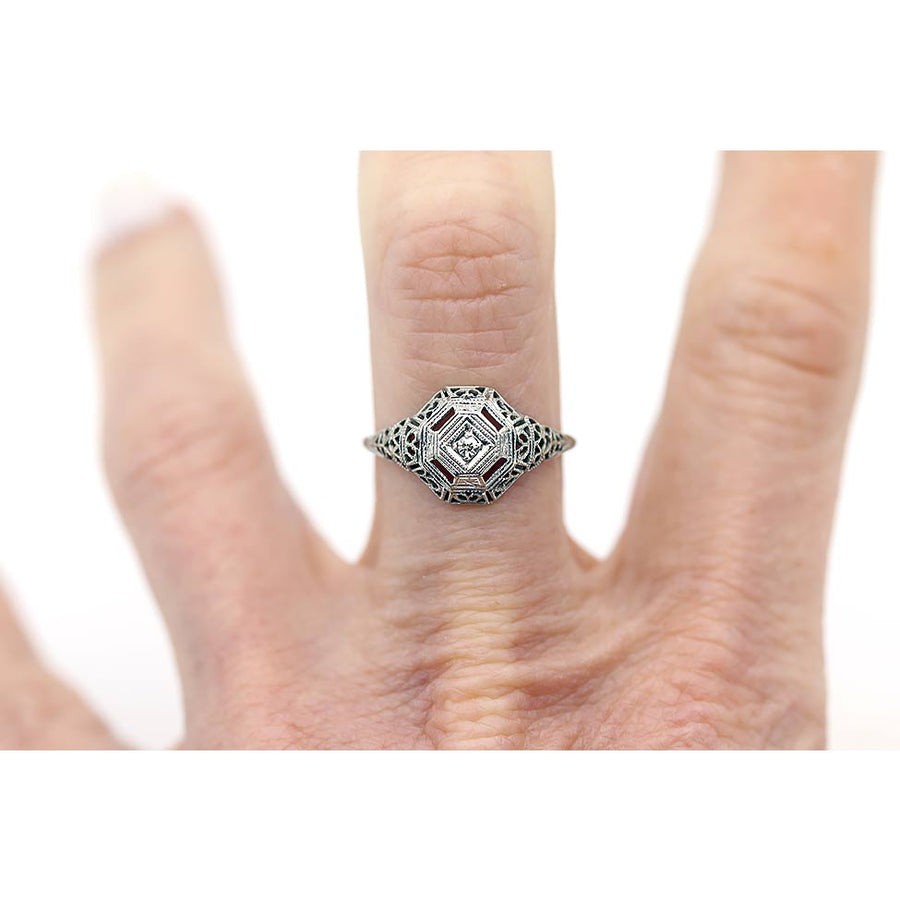 The Bedrich ring is a delicate vintage engagement ring from the Art Deco era circa 1920s. This ring features a dainty .03 carat single cut diamond of H color and VS2 clarity, residing within a geometric frame. Beautifully crafted in 18 karat white gold and accentuated with open metal work and delicate milgrain engravings, this is a lovely vintage piece in very good condition.
