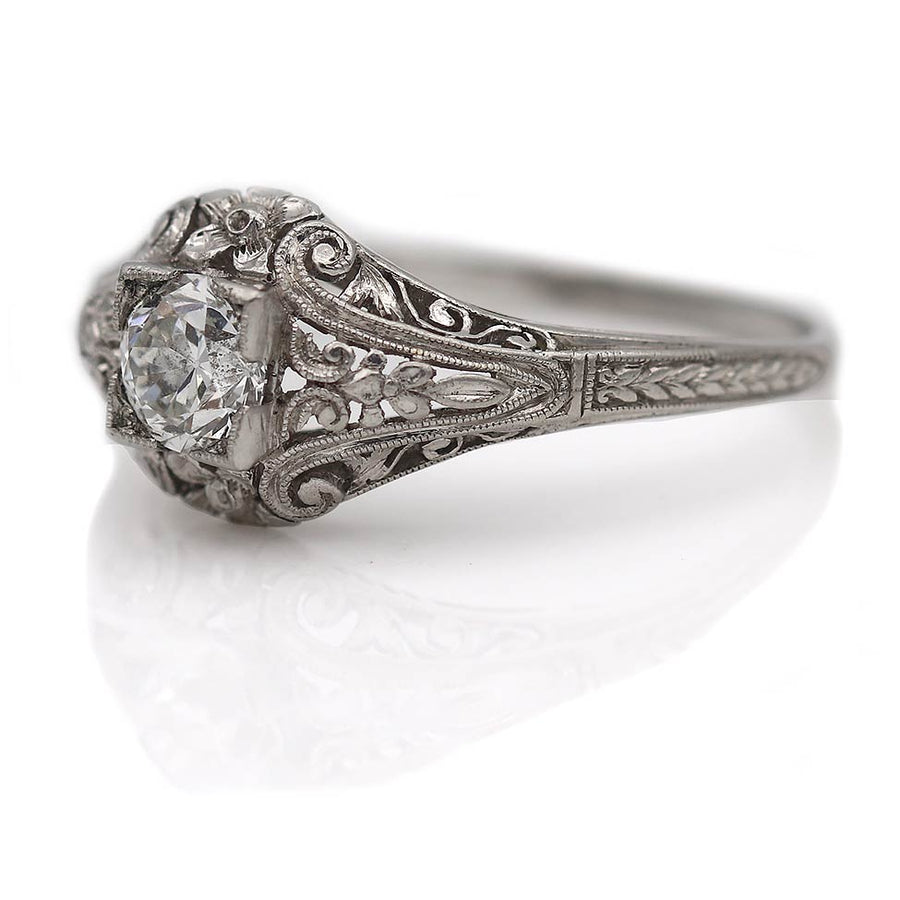 The Estucha ring is an authentic vintage engagement ring from the Art Deco era circa 1930's. The ring features a sizzling .53 carat old European cut diamond of G color, VS2 clarity, residing beautifully in a geometric square milgrain frame. Crafted in platinum, accentuated with swirls of metal work and intricate filigree engravings. A rare, magnificent vintage jewel! One of the finest rings we have ever owned. In pristine condition.
