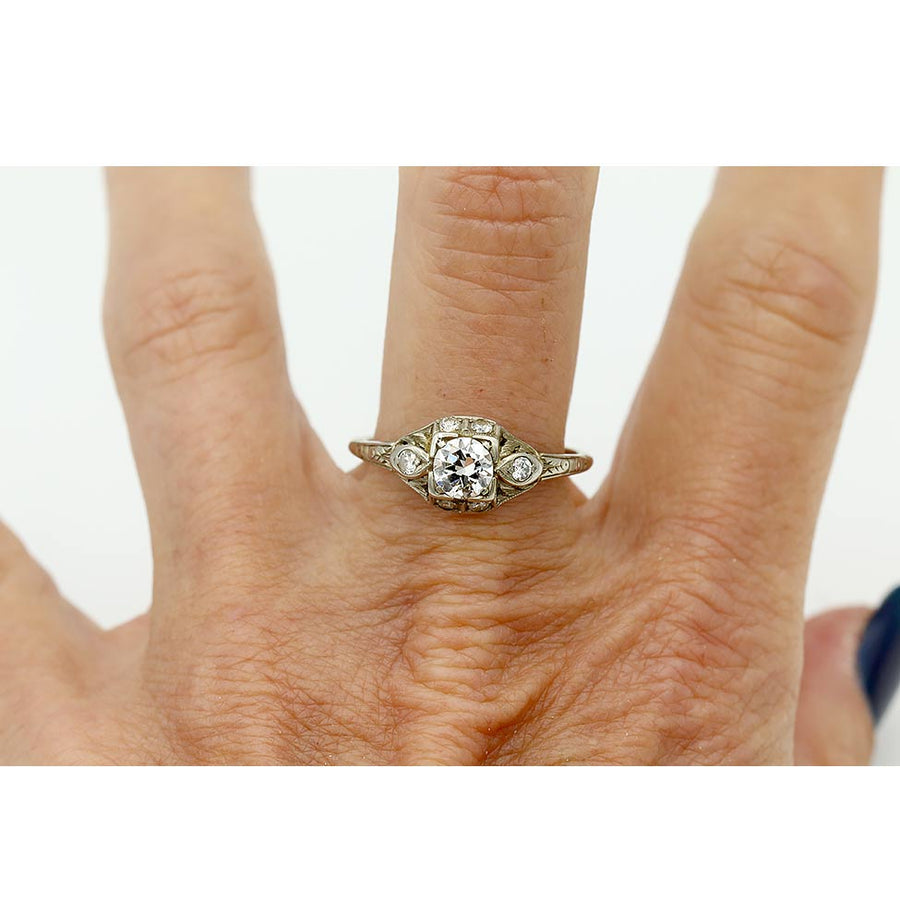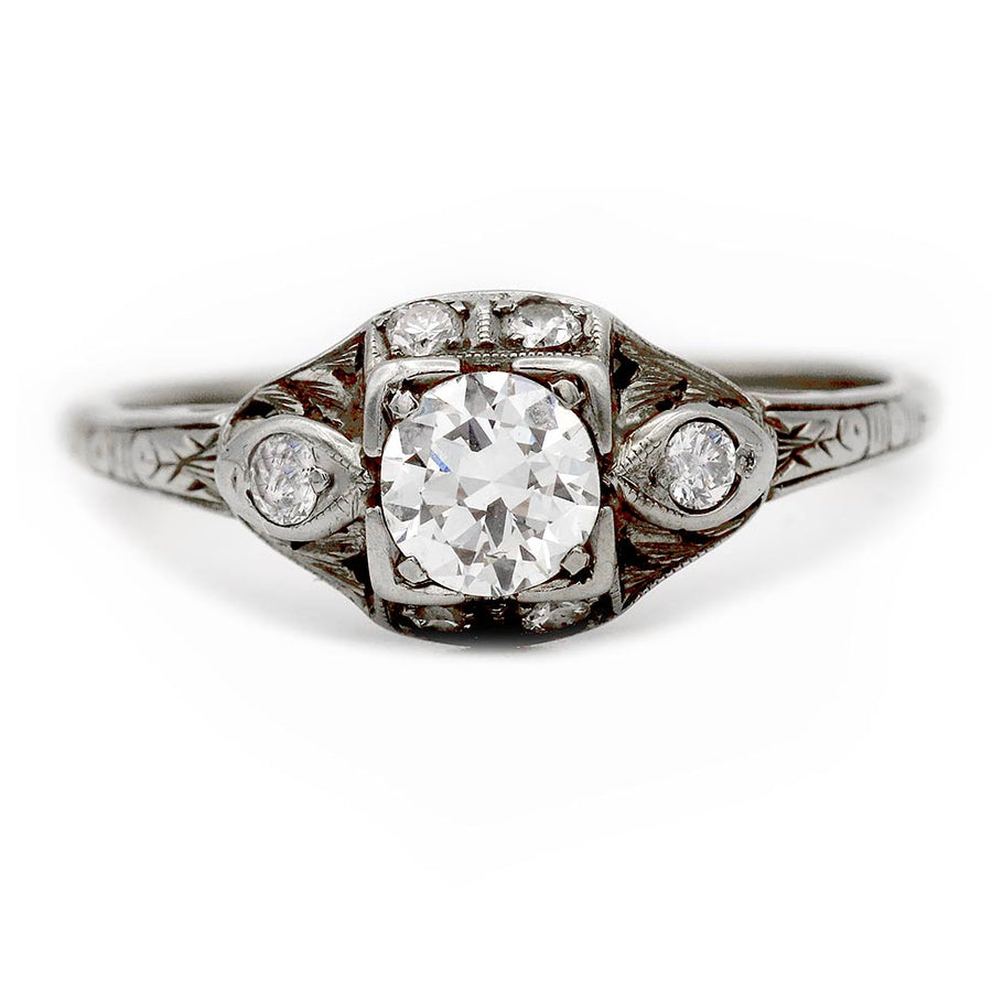The Leah ring is a delicate and authentic vintage diamond ring circa 1920s. The ring features a bright-white .50 carat old European cut diamond of F color, VS2 clarity, residing in a geometric square frame. The diamond is flanked by 6 single cut diamond accents. Crafted in 14 karat white gold, completed with milgrain and filigree engravings. A sweet, petite vintage ring. In very good condition.