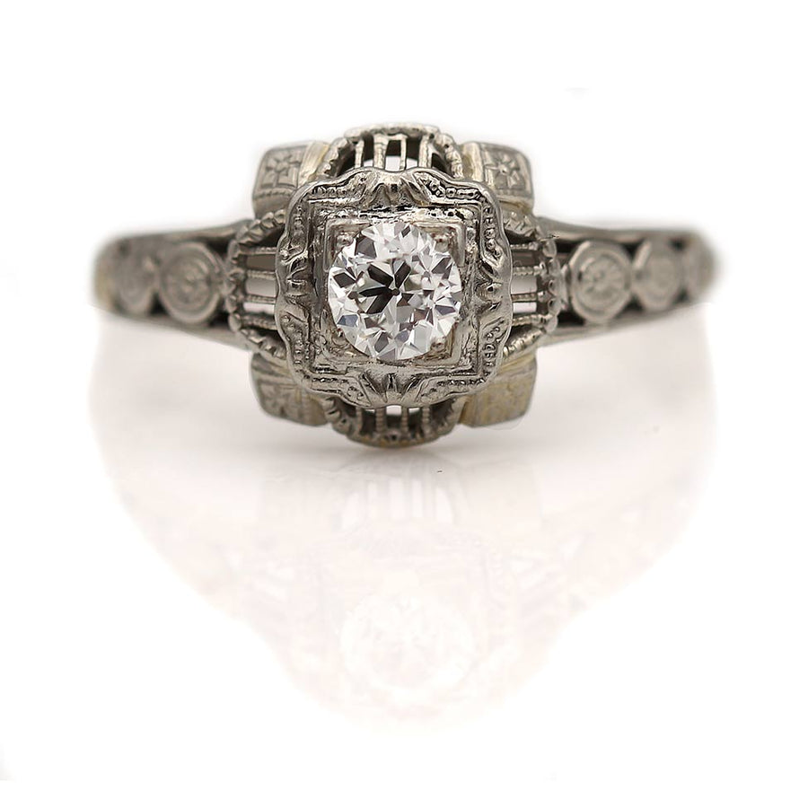 The Jessy M ring is an authentic vintage engagement ring from the Art Deco era, circa 1930s. This unique Art Deco engagement ring features a .25 carat old European-cut diamond of H color and VS2 clarity residing within a geometric square frame and is surrounded by a delicate halo of filigree and milgrain engravings. Beautifully handcrafted in 18 kt white gold, and accentuated with floral engravings. A sweet vintage ring in good condition.