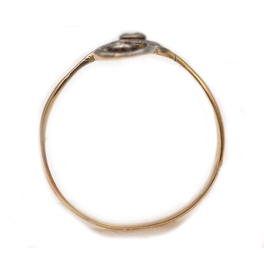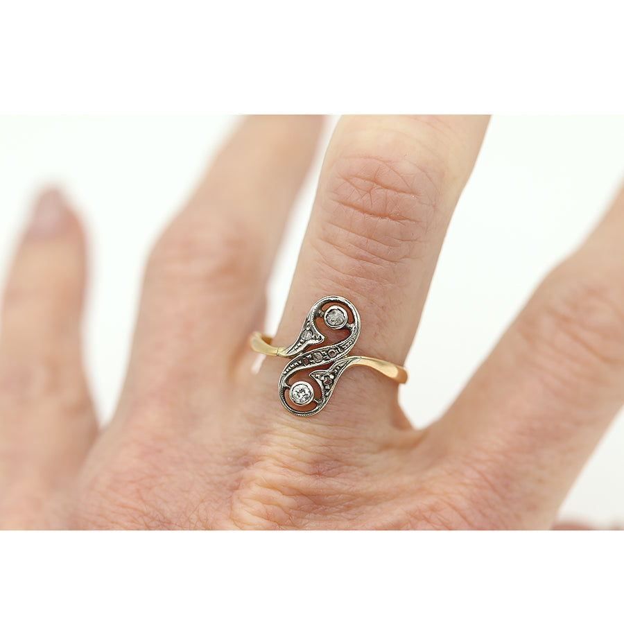 The Judy G ring is an authentic vintage Toi Et Moi ring, circa 1910's. This ring features two (2) bezel set rose cut diamonds, surrounded by five (5) rose cut diamond accents. Crafted in 14 kt two tone gold, accentuated with delicate milgrain engravings. As sweet as can be, perfect to wear on either hand! In good condition.