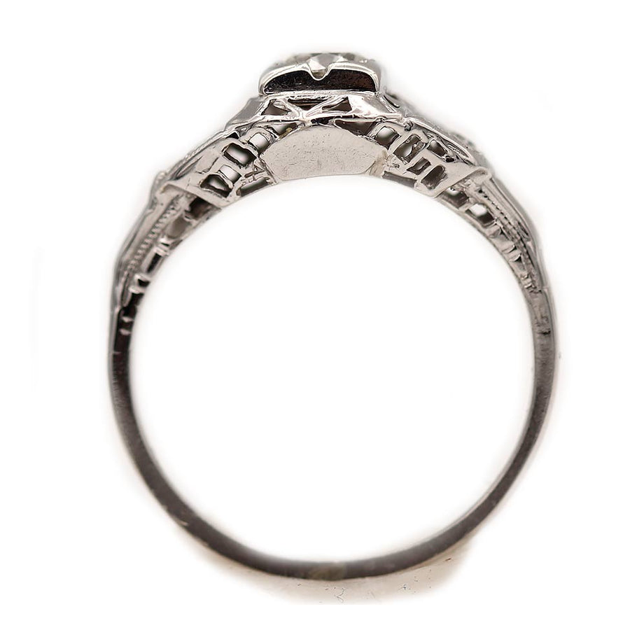 The Ginnie ring is an authentic vintage diamond engagement ring from the Art Deco circa 1930's. The ring features a .35 carat old European cut diamond of H color and SI1 clarity, residing in a geometric square frame. The diamond is flanked by 4 single cut diamond accents. Handcrafted in 14 karat white gold, accentuated with open metal work and delicate milgrain engravings. A sweet, elegant vintage ring. In very good condition.