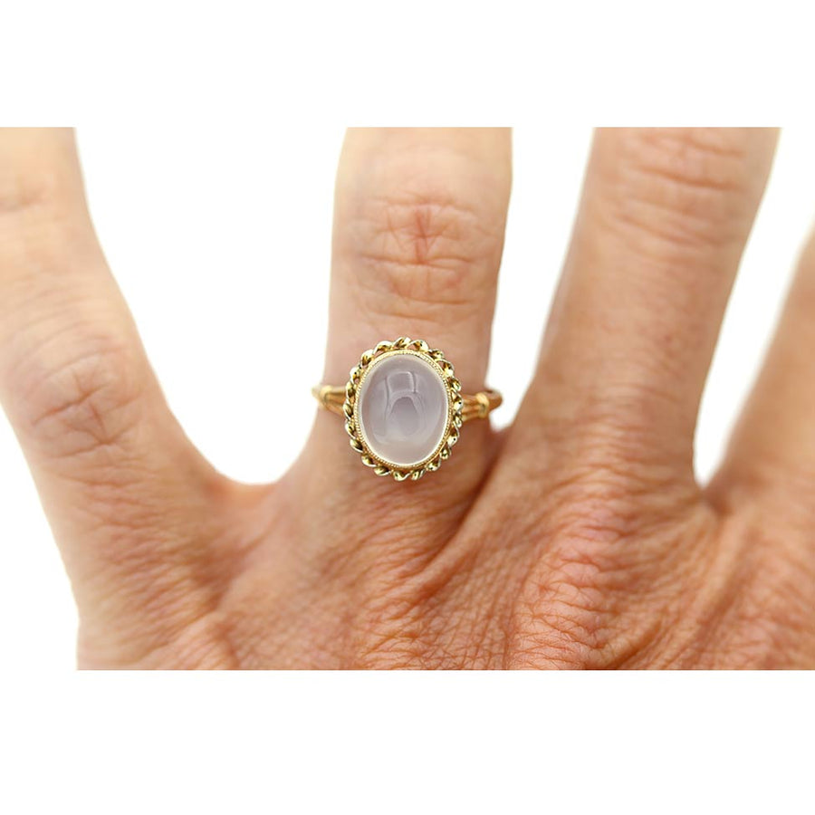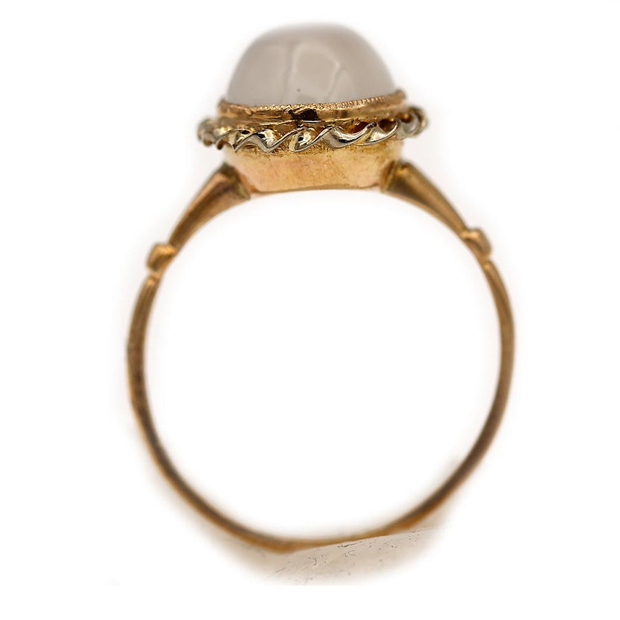 The Fain Ring is a beautiful vintage gemstone engagement ring from the Victorian era, circa early 1900s. This ring features a natural, bezel-set cabochon moonstone of about 2.50 carats, set in 10k yellow gold. The band is accentuated with delicate milgrain and filigree engravings, adding unique character to this bold piece. A standout gemstone ring that looks stunning on either hand, it’s in very good condition and ready to become a treasured part of your collection.