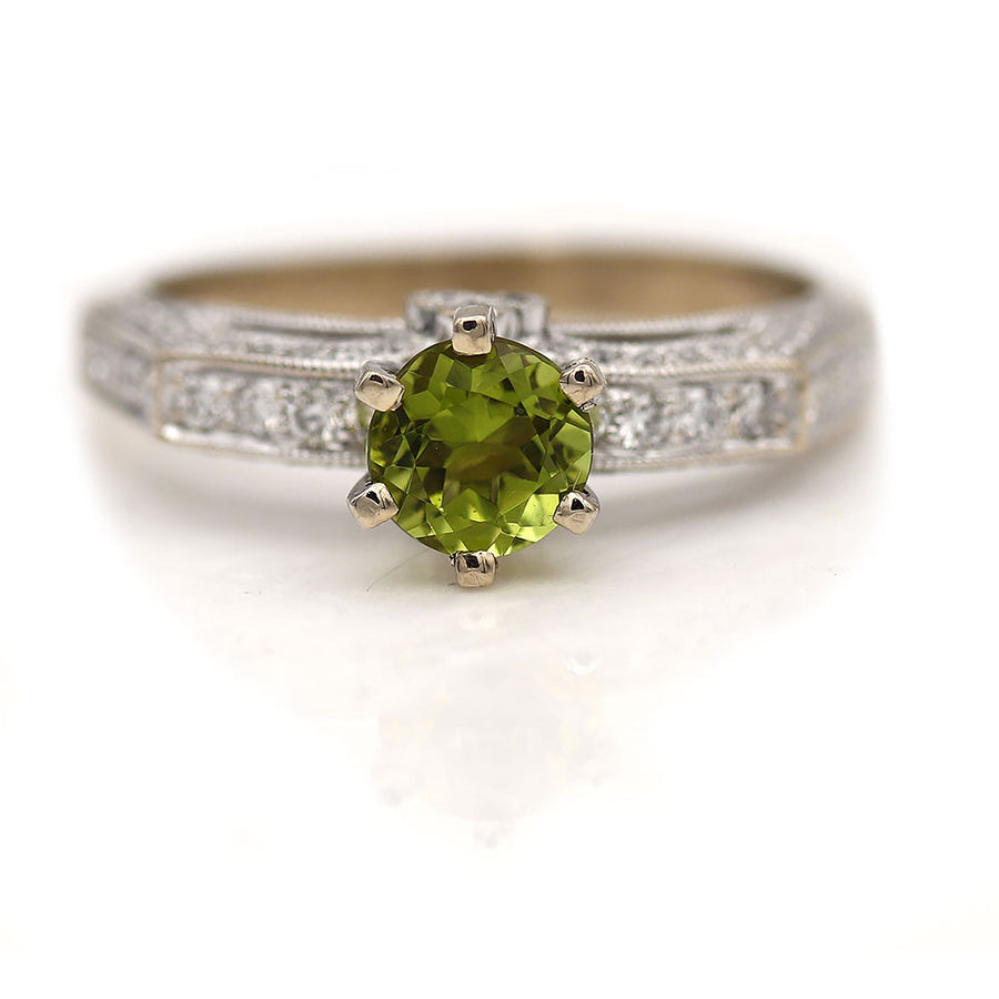 Estate Vintage Style Peridot and Pave Set Diamond Engagement Ring