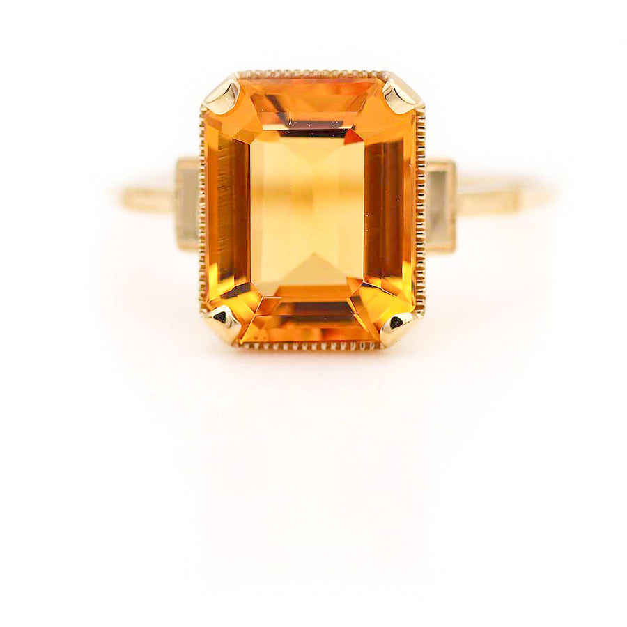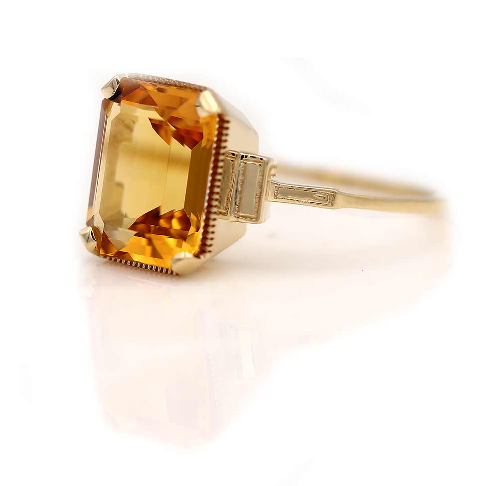 The Sigal ring is an Art Deco-inspired VDR.com-made citrine engagement ring using an authentic citrine circa 1970's. The ring boasts a natural honey colored 3.07 carat emerald cut citrine. Beautifully crafted in recycled 14 karat yellow gold, accentuated with linear and delicate milgrain engravings. This is an exact replica of an original vintage engagement ring we once owned. Made with love in NYC. A super natural citrine ring which will spread the finger beautifully. Also available in white, platinum and rose gold. Takes 2-3 weeks!