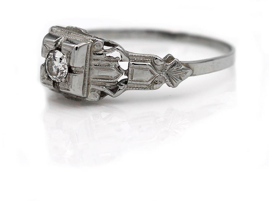The Nadina ring is an authentic antique engagement ring from the Art Deco era, circa 1930s. It showcases a .15 carat Old European cut diamond (H color, VS2 clarity) set in a geometric square frame. Crafted in 14-karat white gold, the setting is detailed with delicate filigree and clean linear engravings. This classic piece is in very good condition and offers a timeless look. Ready to ship.