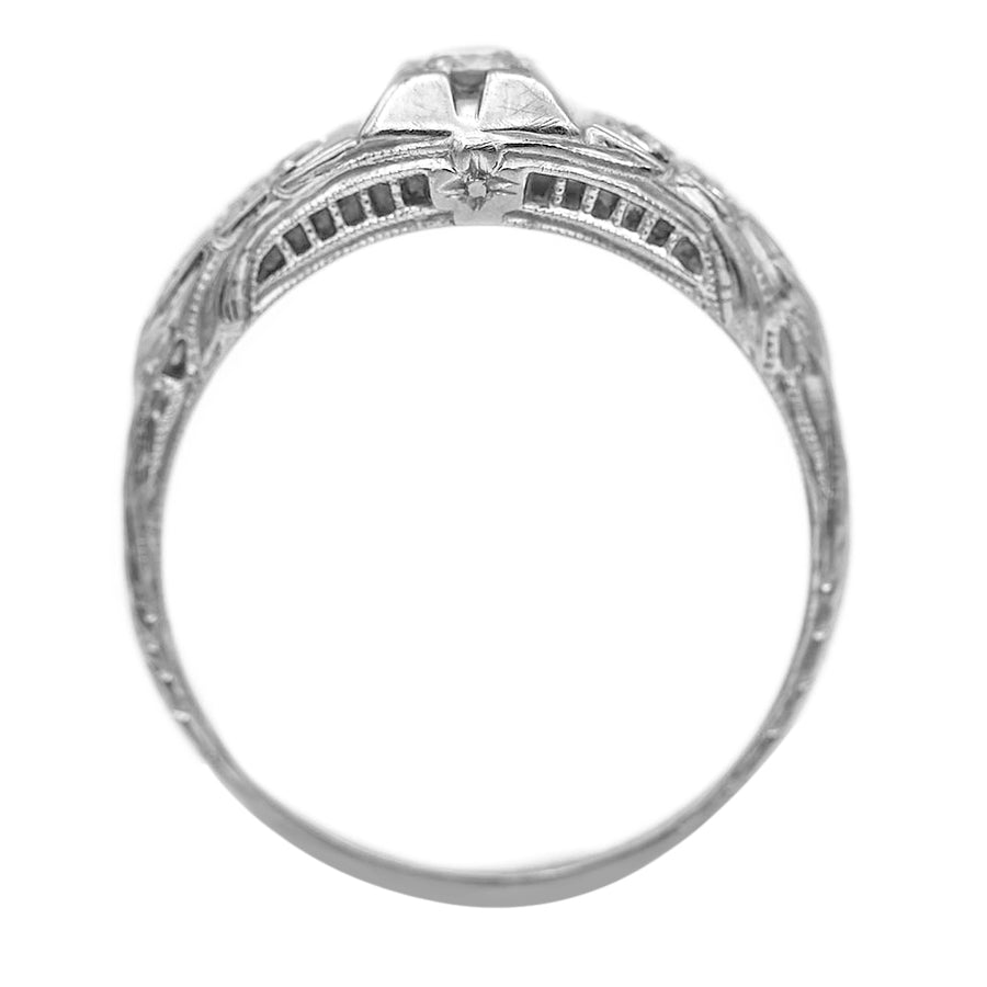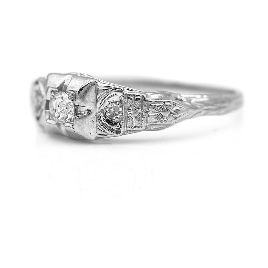 The Fanny ring is a stunning and authentic antique engagement ring from the Art Deco era circa 1920's. The ring features a dazzling .20 carat old European cut diamond of H color, VS2 clarity, residing in a geometric square frame. The diamond is flanked by 2 twinkling single cut diamond accents. Crafted in 18 karat white gold, completed with delicate filigree and floral engravings. Timeless and simply lovely! In very good condition.