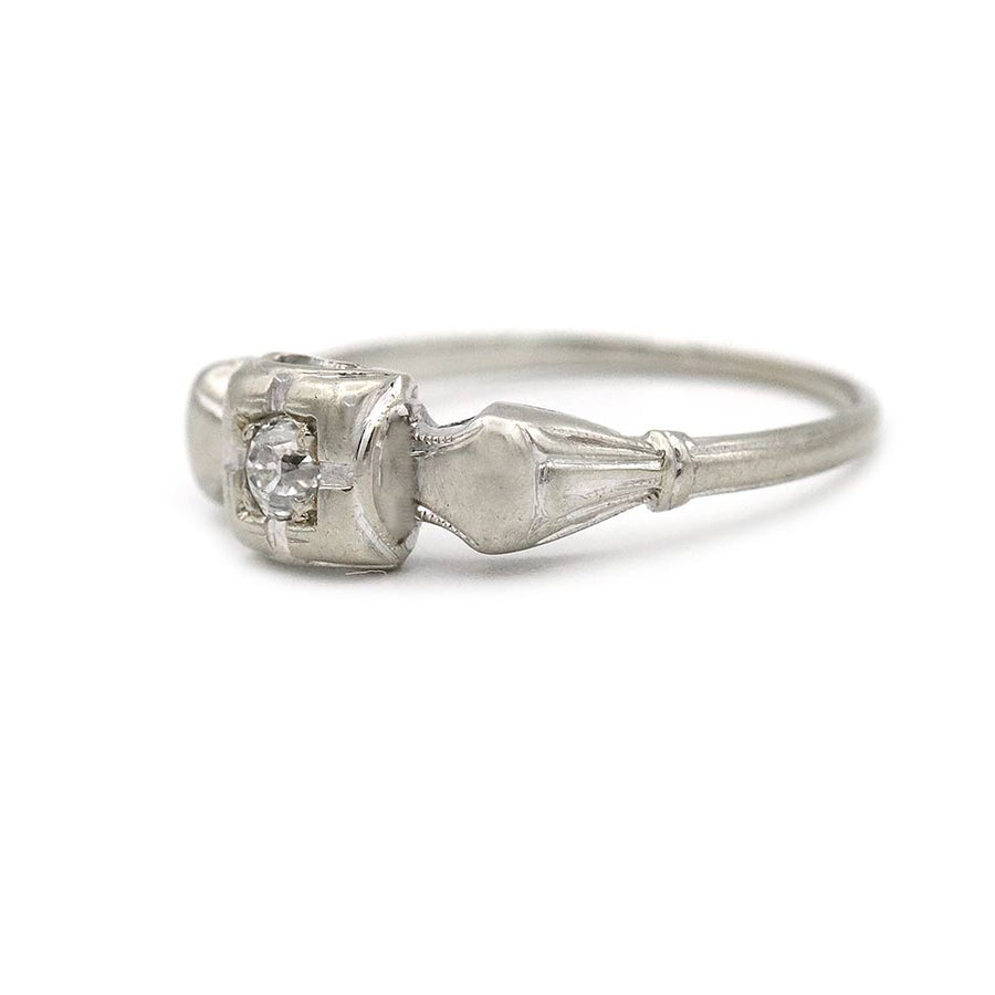 The Jessi ring is an authentic antique diamond ring from the 1930s. It features a bright white .15 carat Old European cut diamond (G color, VS2 clarity) set in a geometric square frame with gently tapered shoulders. Crafted in 18 karat white gold and finished with delicate milgrain engraving. A charming Art Deco solitaire in good antique condition.