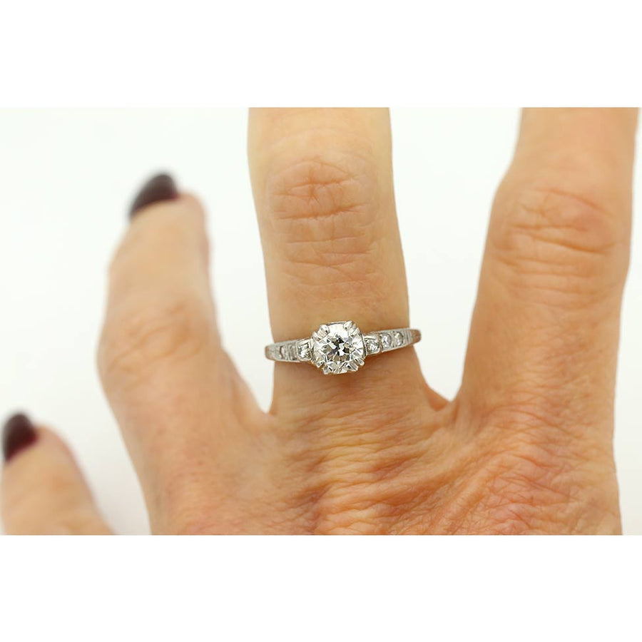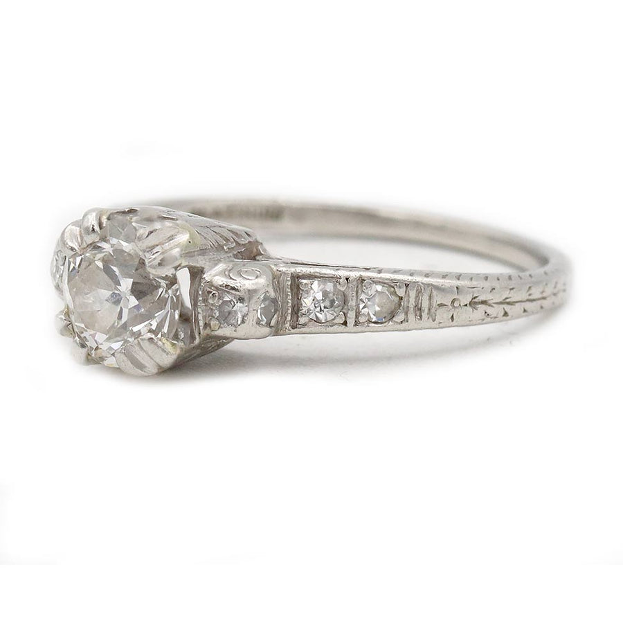 The Lila ring is an authentic Art Deco engagement ring dating to the 1940s. It features a .70 carat old European cut diamond of J color and VS2 clarity, set within a trefoil-style four double prong platinum mounting. The center stone is accented by eight single cut diamond side stones, adding balance and subtle brilliance to the design. Beautifully crafted in platinum, the setting is enhanced by scrolling metalwork and delicate filigree engravings characteristic of the period. The ring shows gentle wear consistent with age, retaining the perfect amount of patina that reflects its vintage character. Offered in good vintage condition.