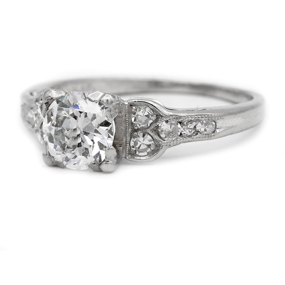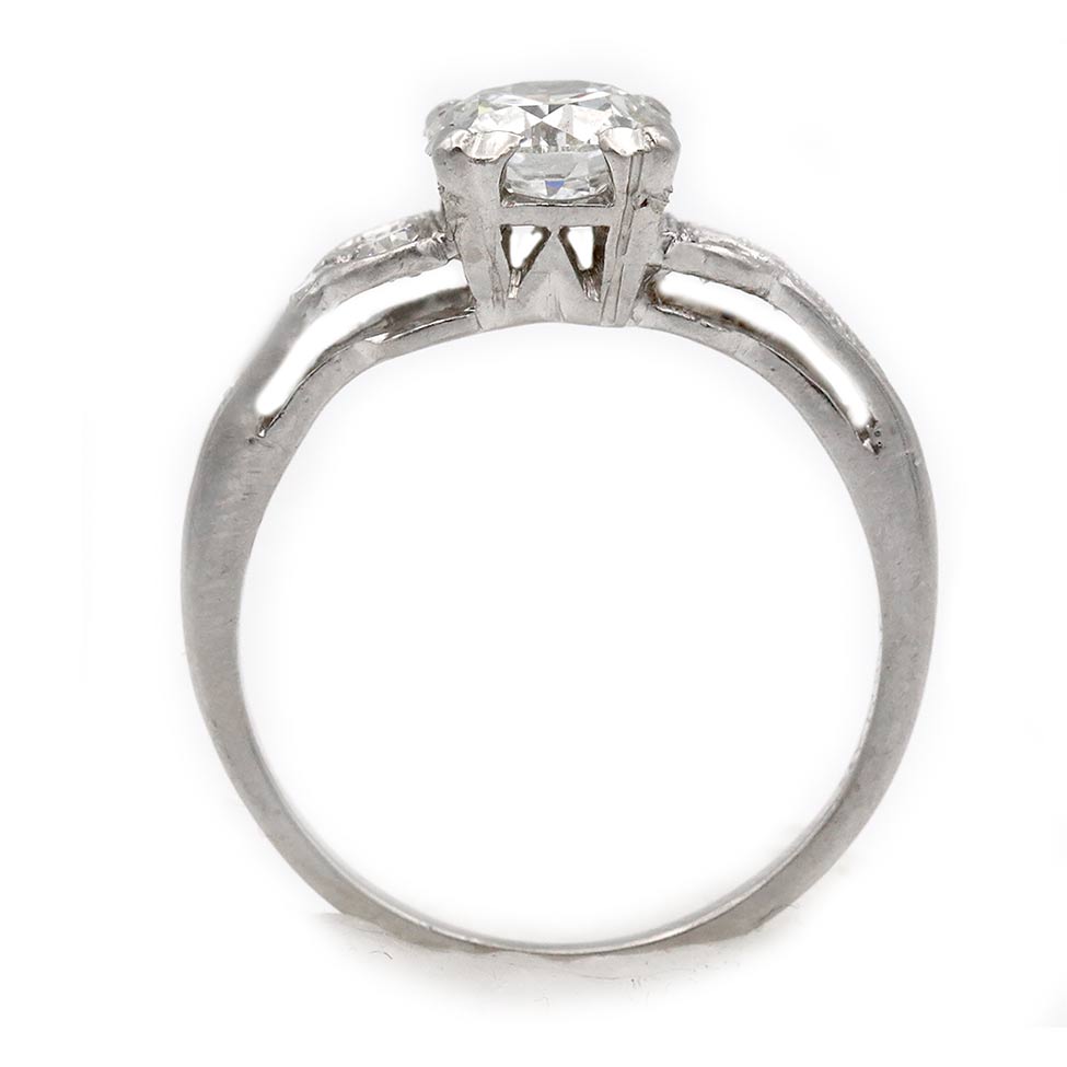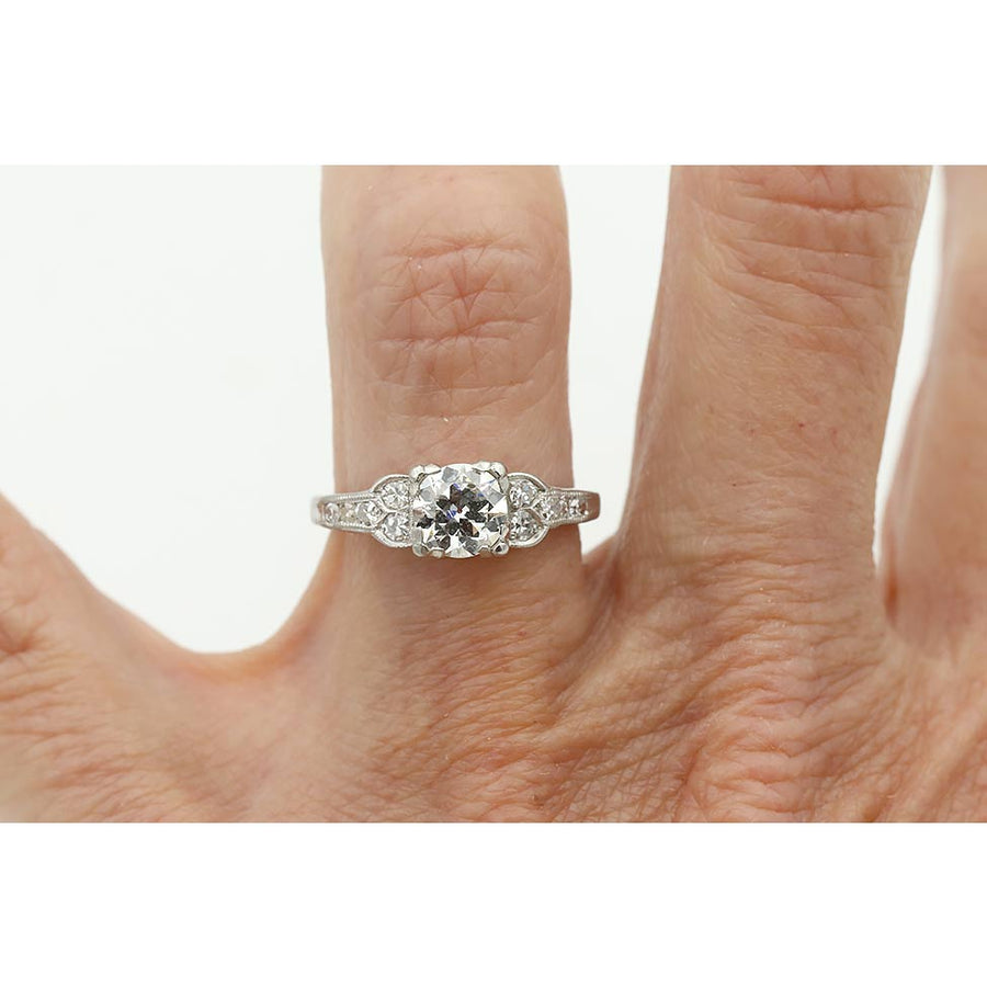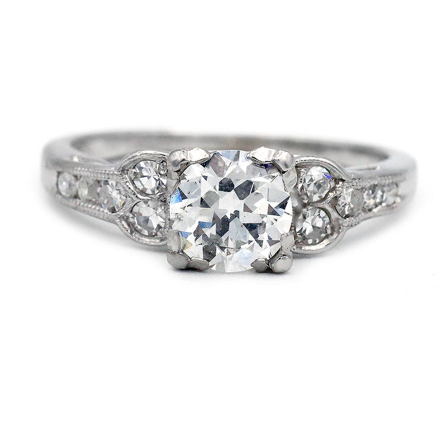 Refined and elegant in its proportions, the Taught ring reflects the craftsmanship and timeless geometry that define the Art Deco era. This authentic Art Deco diamond engagement ring, dating to the 1930s, centers a bright-white GIA-certified .81 carat old European cut diamond graded G color and SI2 clarity, gracefully set within trefoil prongs. Ten single-cut diamond accents flank the center stone, bringing the total diamond weight to approximately 1.01 carats. Beautifully crafted in platinum and finished with delicate milgrain engraving, this timeless Art Deco ring is offered in good vintage condition.