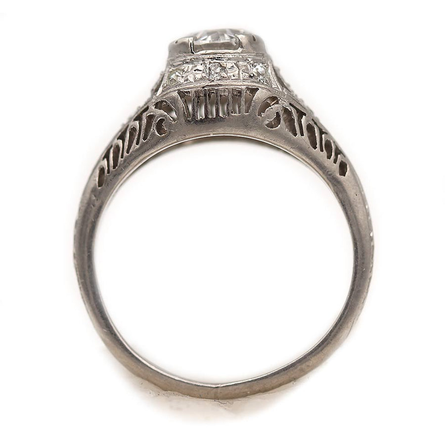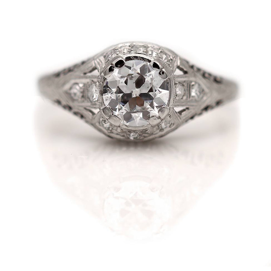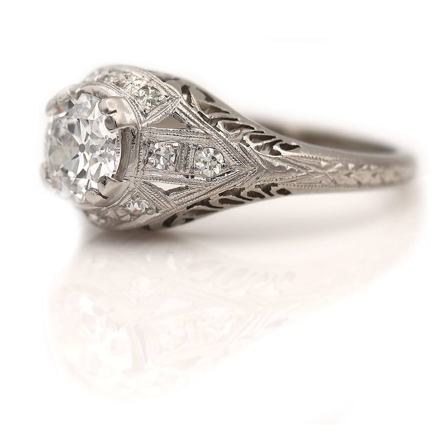 The Mostel ring is an authentic vintage diamond engagement ring from the Art Deco era, circa 1930s. This ring showcases a .91 carat old European cut diamond of D color and I1 clarity surrounded by ten (10) single cut diamond accents. Crafted in platinum and accentuated with delicate milgrain engravings and open metal work. A timeless vintage piece, in good condition.
