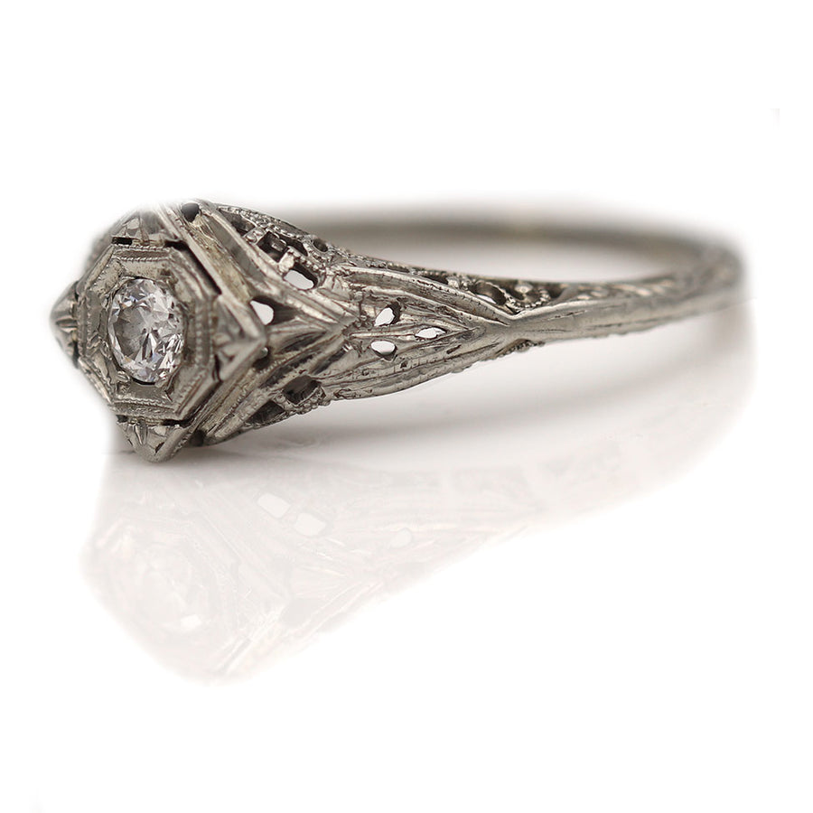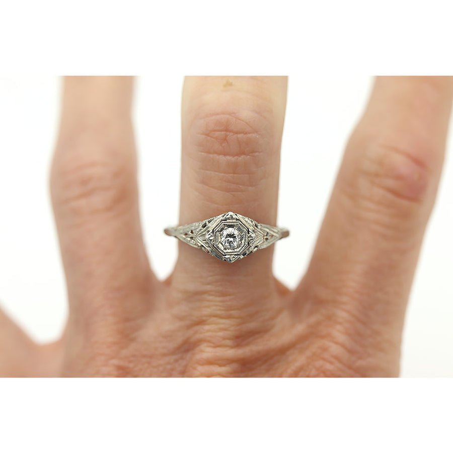The Moment ring is an authentic vintage engagement ring from the Art Deco era, circa 1930s. This ring features a bright-white .15 carat old European cut diamond residing in a geometric octagonal frame. Beautifully crafted in 14 kt white gold and accentuated with delicate filigree engraving and open metal work. A lovely Art Deco piece. In good condition.