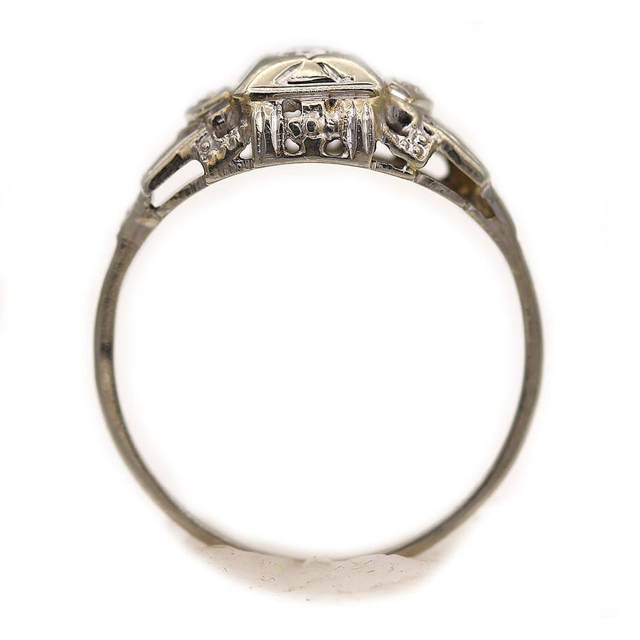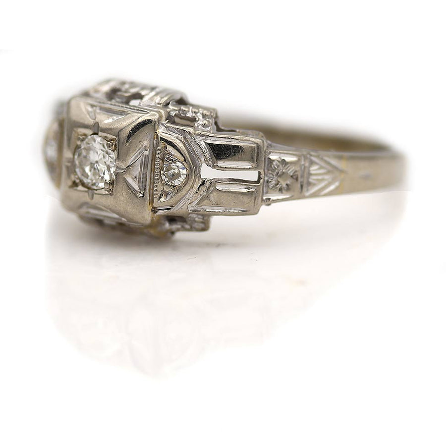 The Maye ring is an authentic vintage engagement ring from the Art Deco era, dating to the 1930s. At its center is a .15 carat European cut diamond graded G color and VS1 clarity, set within a crisp geometric square frame. The center stone is flanked by two single cut diamond accents, adding subtle balance and sparkle. Beautifully crafted in 18 karat white gold, the ring is finished with delicate filigree and milgrain engraving—hallmarks of fine Art Deco design. A timeless vintage engagement ring, offered in very good condition.