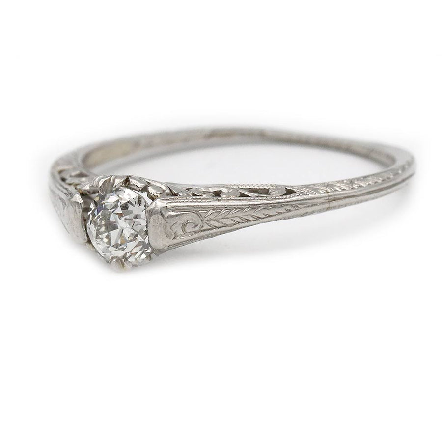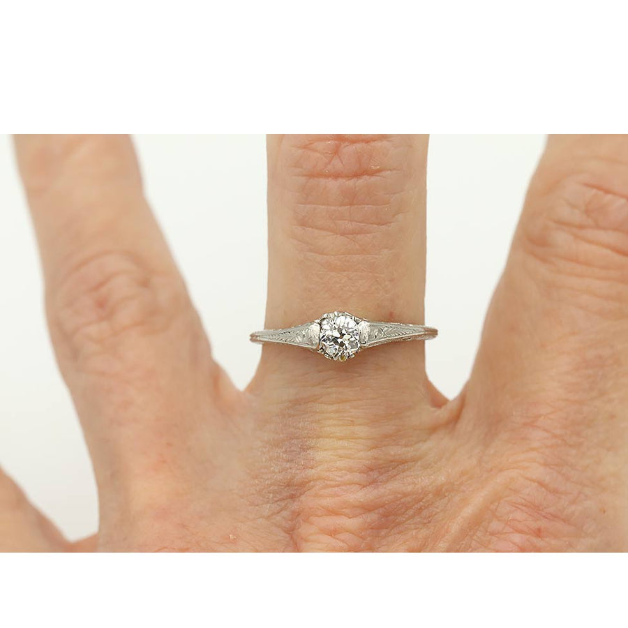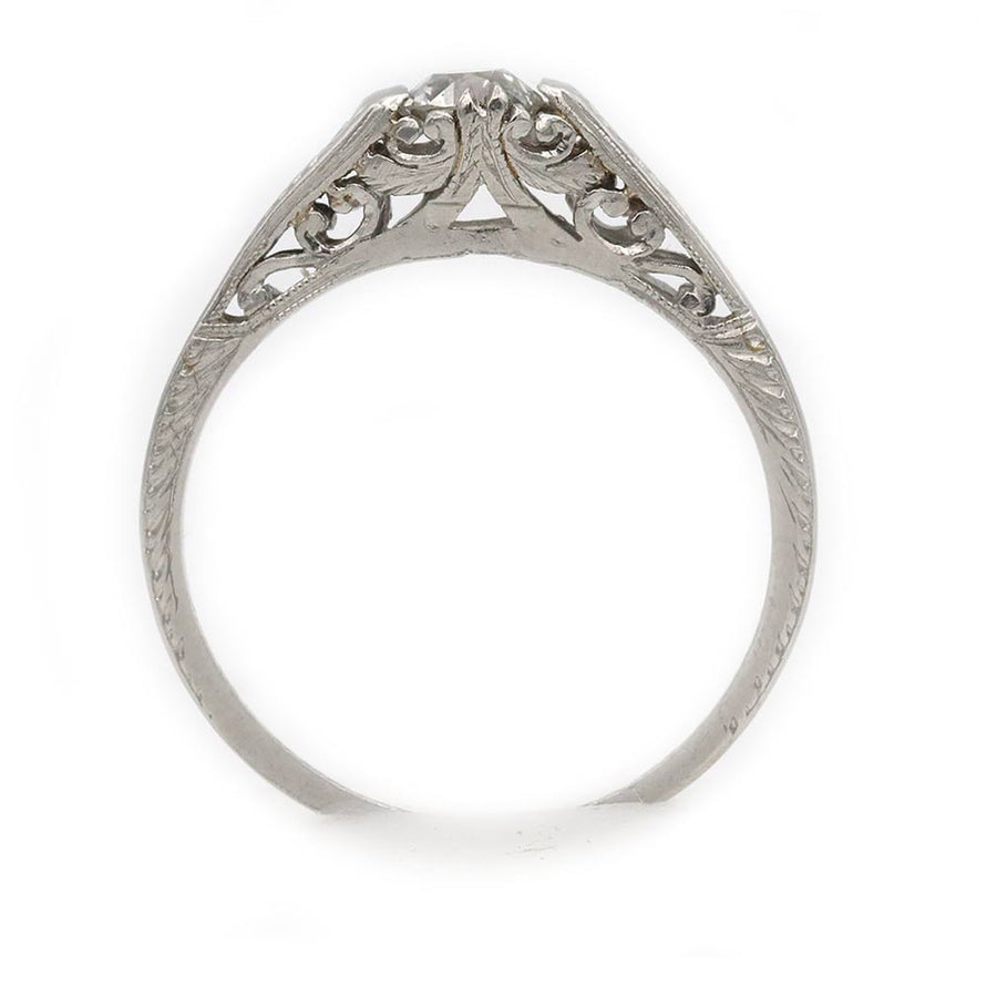 The Eiko ring is an authentic vintage engagement ring from the Art Deco era, circa 1930s. It features a .35 carat Old European cut diamond of H color and SI1 clarity. Beautifully handcrafted in platinum, the setting is detailed with graceful swirls of open metalwork, fine filigree engraving, and a softly tapered band. A sleek, classic Art Deco engagement ring with subtle vintage character, preserved in very good condition.