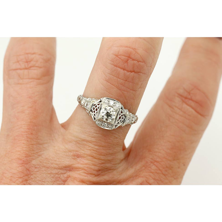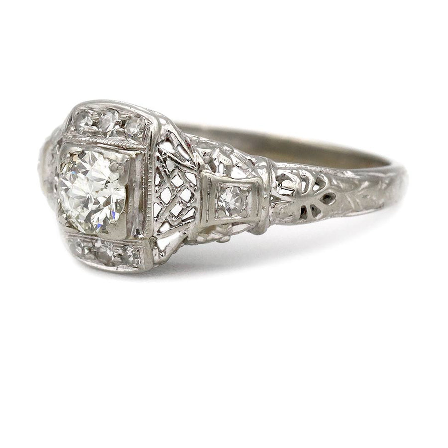 The Bettina ring is an authentic vintage diamond engagement ring from the Art Deco era circa 1930's. The ring showcases a glittering .30 carat old mine cut diamond with J color and VS1 clarity, residing in a geometric square frame. The diamond is surrounded by 8 single cut diamond accents. Crafted in 18 karat white gold ring, accentuated with open metal work and with milgrain engravings. Distinctive and so lovely!