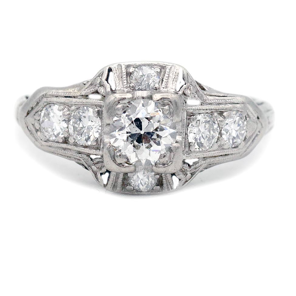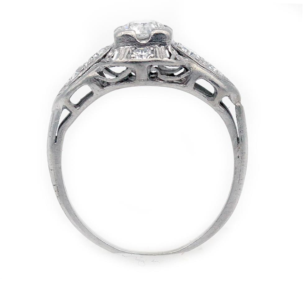 The Katerina ring is an authentic Art Deco engagement ring from the 1930s, centered with a .35 carat old European cut diamond graded G color and SI2 clarity, set within a crisp geometric square frame. The center stone is flanked by six old European cut diamond accents, bringing the total diamond weight to approximately .50 carats. Crafted in platinum, the ring is finished with open metalwork and delicate milgrain engravings characteristic of the Art Deco era. A refined and timeless vintage design in vintage good condition.