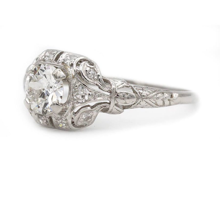 The Morgan R ring is an authentic Art Deco engagement ring from the 1930s, centered with a .85 carat prong-set Old European cut diamond graded H color and VS2 clarity. The center stone is framed by twelve single-cut diamond accents, adding subtle sparkle while maintaining the ring’s crisp geometric balance. Crafted in platinum, the ring features delicate open metalwork along a refined split shank, accented with fine milgrain and filigree engraving. This piece reflects the careful craftsmanship typical of the Art Deco era and remains beautifully preserved in very good condition.