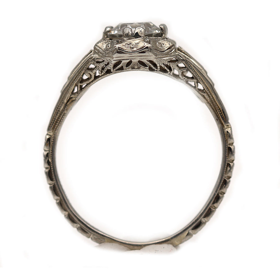 The Perri R ring is an authentic vintage engagement ring from the Art Deco era, circa 1930s. It features a GIA-certified .89 carat Old European cut diamond (H color, SI2 clarity) flanked by linear filigree shoulder accents. Crafted in gleaming 18-karat white gold, the setting is detailed with intricate open metalwork and delicate milgrain. The design is finished with a beautiful open gallery and bears the original "Whitehouse" signature and stamp. This rare piece is in very good condition. Ready to ship.