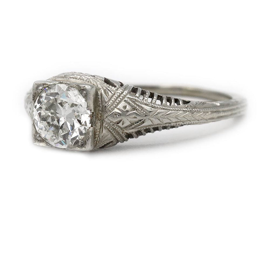 Elegant and striking in its geometry, the Melina ring captures the refined craftsmanship and architectural beauty that define the Art Deco era. This authentic vintage engagement ring, dating to the 1930s, features an AGI certified .95 carat old European cut diamond of J color and SI2 clarity, set within a distinctive geometric square frame. Beautifully crafted in 14 karat white gold, the setting is enhanced by open metalwork and intricate filigree engravings that highlight the period’s attention to detail. Offered in very good vintage condition.