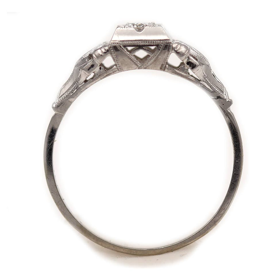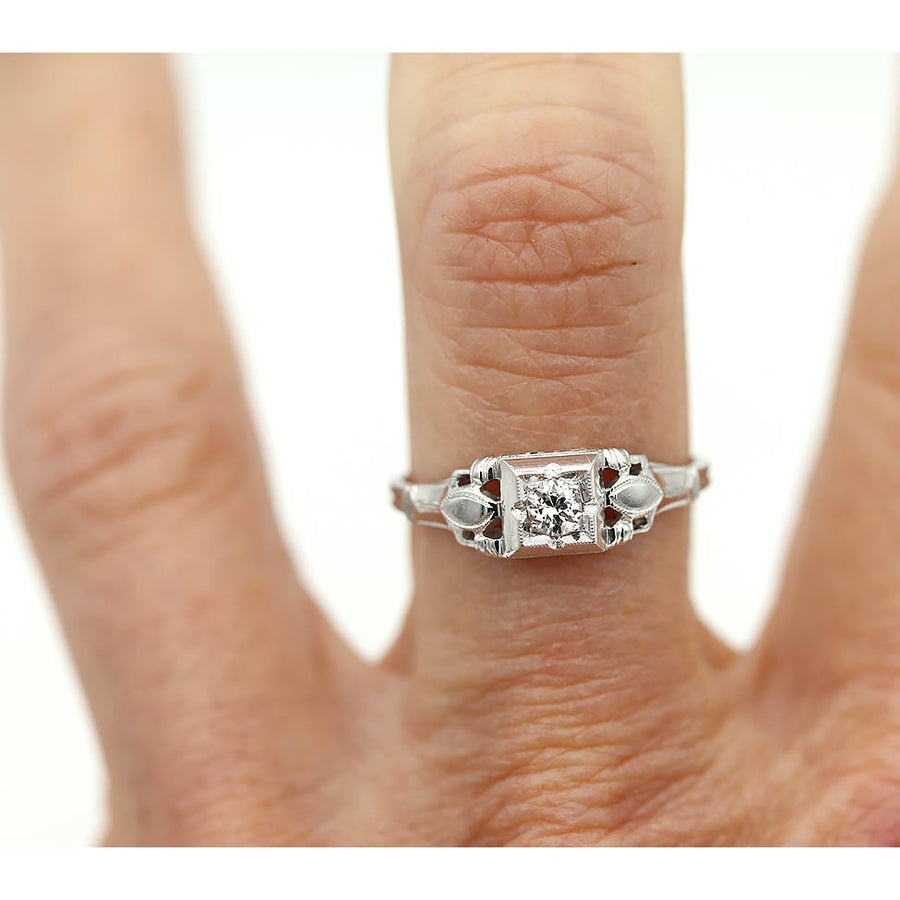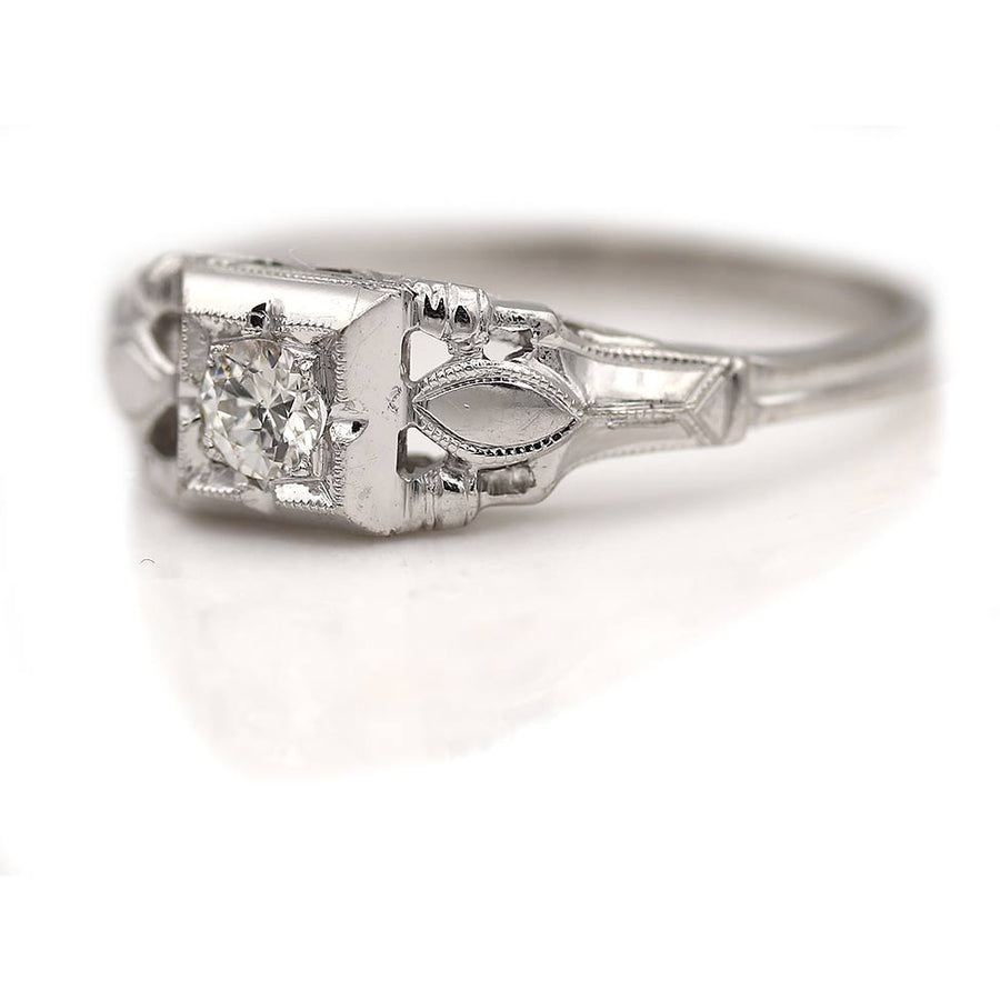 The Antonia ring is an authentic Art Deco diamond engagement ring dating to the 1930s. It features a .20 ct old European cut diamond set within a crisp geometric square frame. Flanking the center stone are a pair of navette-framed filigree engravings that add refined period detail and classic Art Deco symmetry. Beautifully crafted in 18K white gold, the ring is finished with delicate milgrain engraving and a sleek fluted band. A distinctive and elegant Art Deco piece, preserved in very good vintage condition.