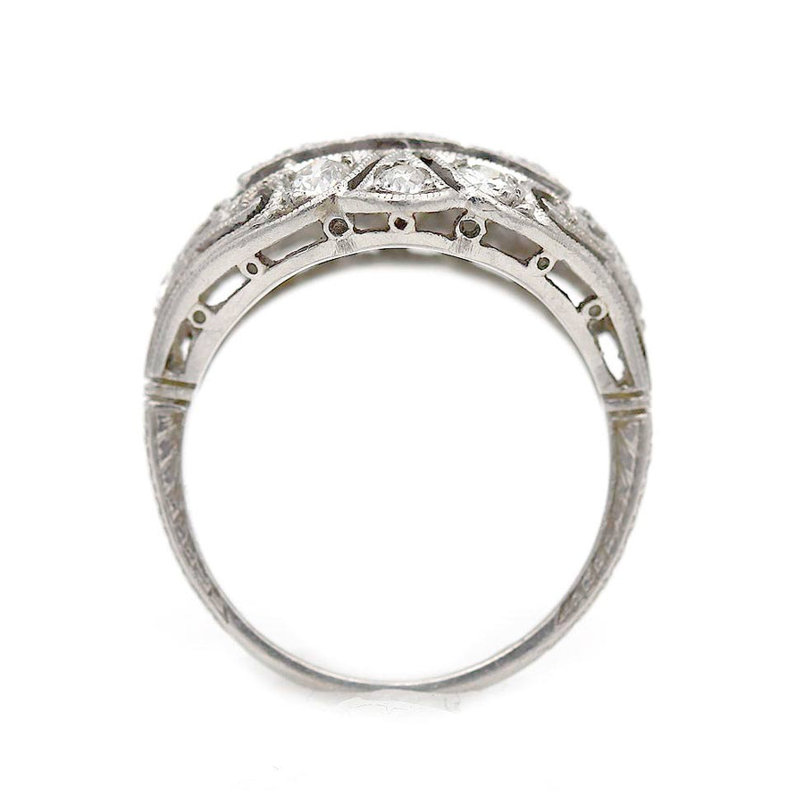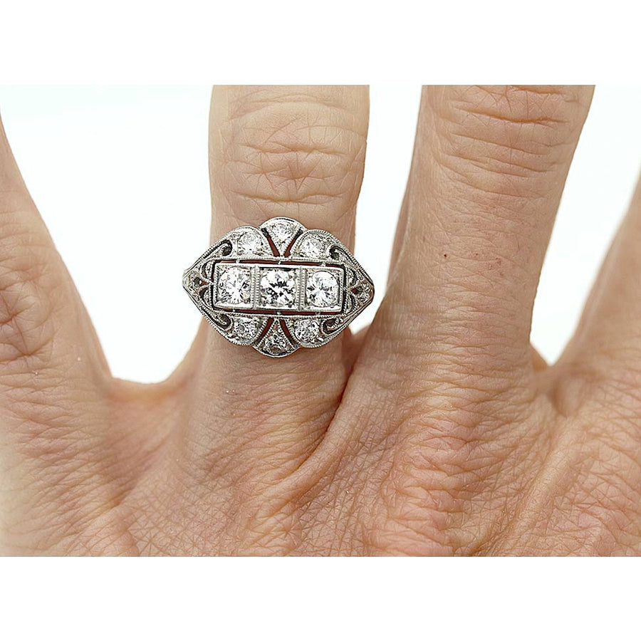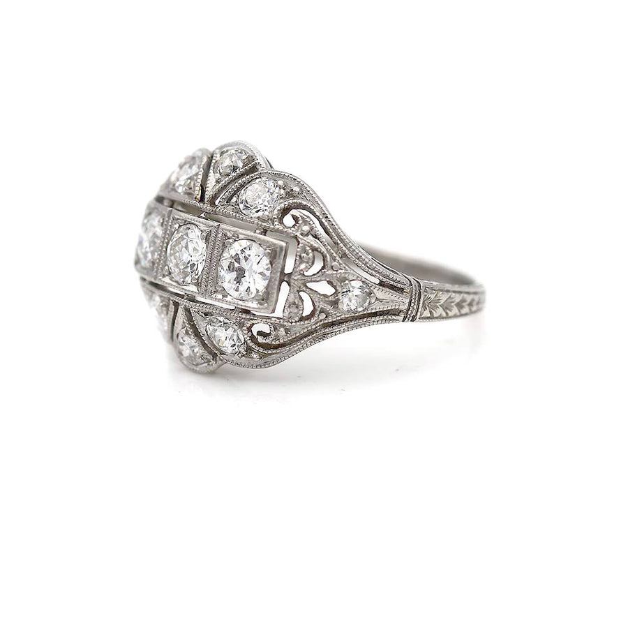 The Ginnia ring is an authentic vintage engagement ring from the Edwardian era, dating to the 1920s. The ring features three bright-white old European cut diamonds totaling approximately .50 carat, surrounded by eight old mine cut diamond accents bringing the total diamond weight to approximately 1.00 carat. The diamonds are graded approximately F color and VS clarity. Beautifully crafted in platinum, the setting is enhanced by flowing metalwork, delicate filigree, and fine milgrain engraving characteristic of the period. Graceful and romantic in its design, this Edwardian ring reflects the lightness and elegance for which the era is admired. Offered in very good vintage condition.