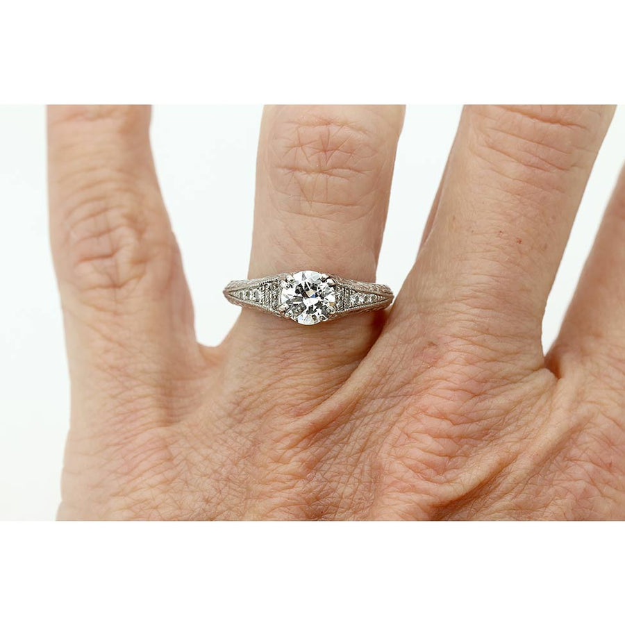 The Saens ring is an authentic estate Art Deco style engagement ring, circa 2000s, showcasing a vintage 1930s GIA certified .69 carat old European cut diamond with G color and SI1 clarity, flanked by fourteen (14) round cut diamond accents. Beautifully crafted in a platinum mounting and accentuated with delicate milgrain and filigree engravings, this is a sweet estate piece, in very good condition.