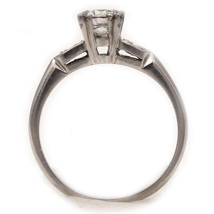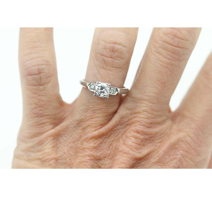 The Ireland ring is an authentic vintage diamond engagement ring dating to the 1940s. It features a glittering GIA-certified .60 carat old European cut diamond graded J color and SI2 clarity, secured in classic trefoil prongs. The center stone is flanked by two single cut diamond accents that add subtle sparkle. Beautifully crafted in platinum and finished with delicate milgrain engraving, this is a timeless three-stone vintage ring offered in very good vintage condition.