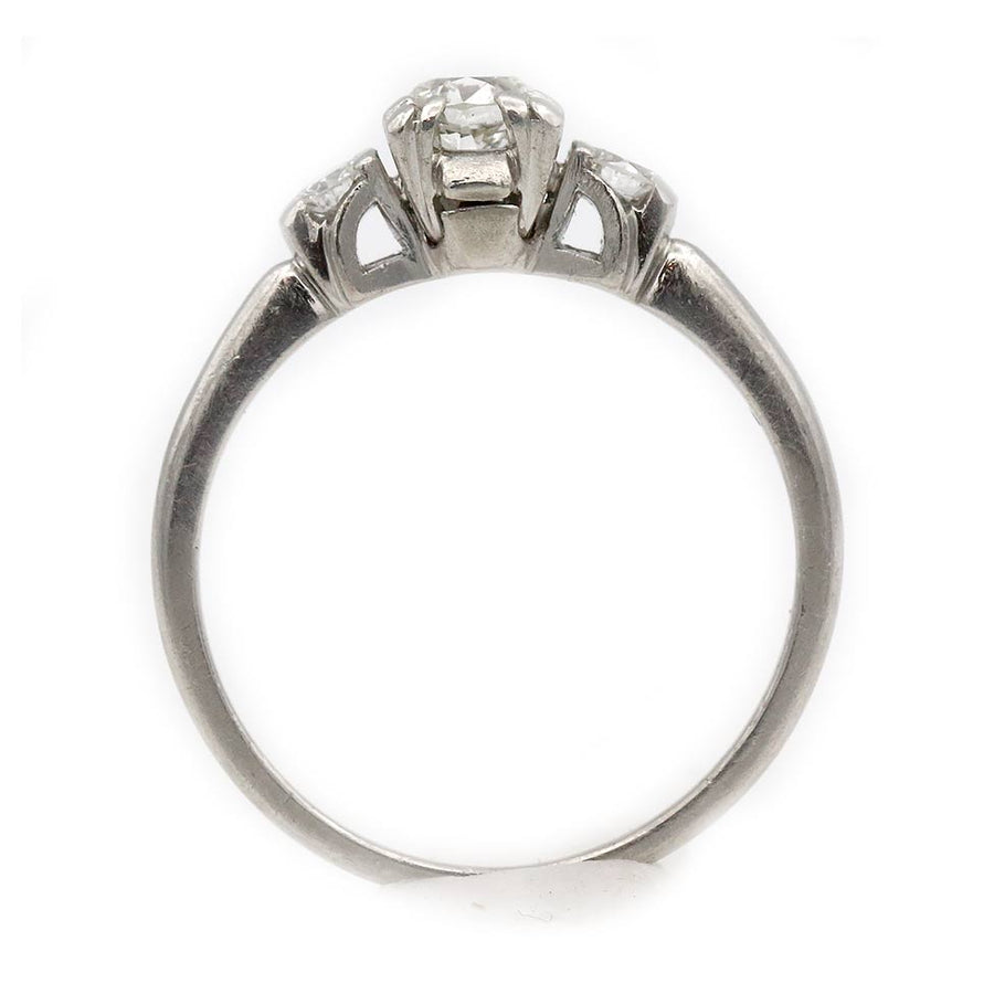 The Amber ring is an authentic vintage engagement ring dating to the 1940s. It features a glittering .35 carat old European cut diamond graded H color and VS2 clarity, secured in classic trefoil prongs. The center stone is flanked by two transitional cut diamond accents, creating a balanced and timeless three-stone design. Beautifully crafted in platinum, this refined vintage engagement ring is offered in very good vintage condition.