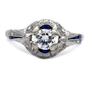 Art Deco .97 Ct Old European Cut Diamond & Sapphire Engagement Ring in Platinum | GIA J/VS1