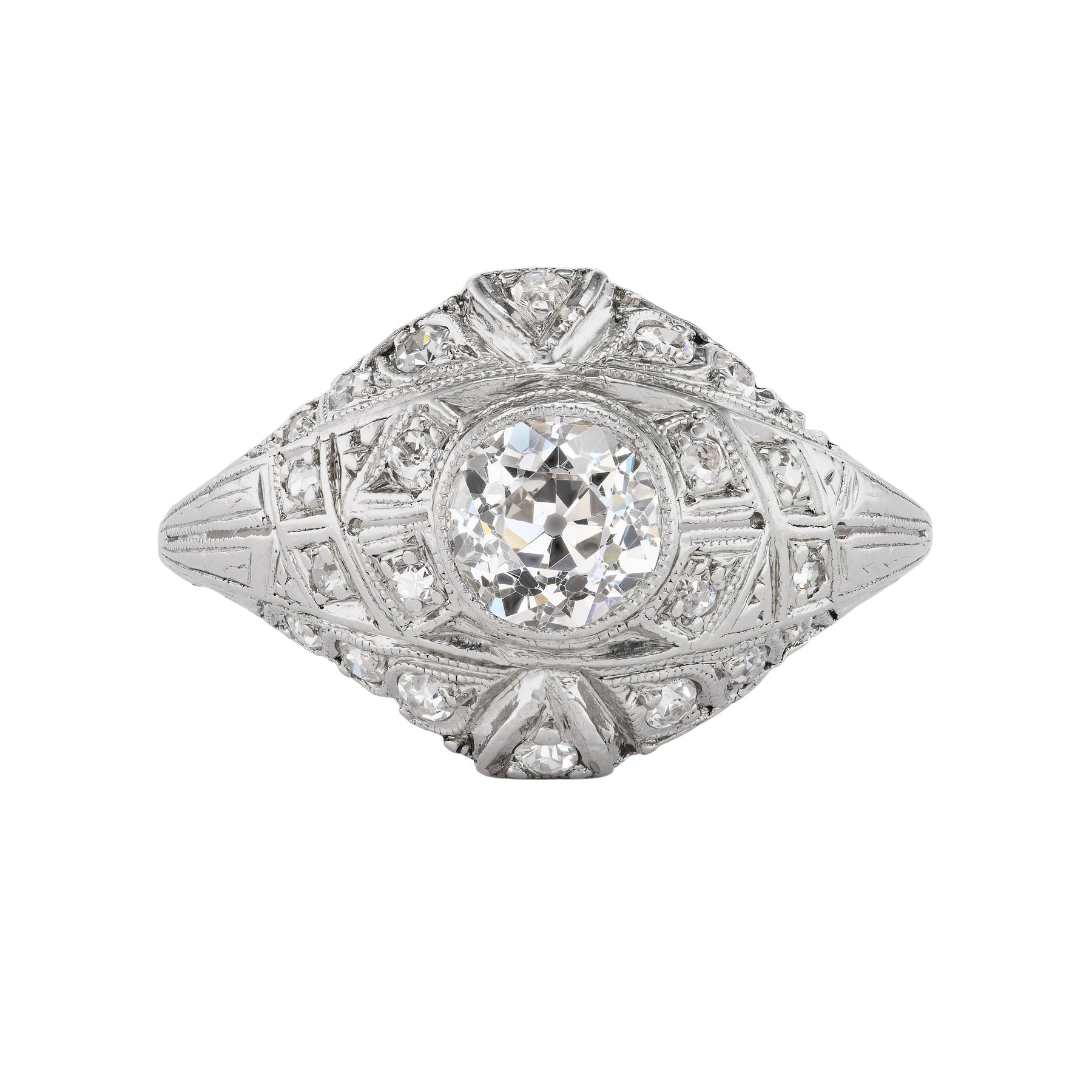 The Kayla ring is an authentic vintage engagement ring from the Edwardian era circa 1920s. The ring showcases a glittering bezel set AGI certified H color, VS2 clarity .85 carat old mine-cut diamond. The diamond is surrounded by 22 single cut diamond accents. Crafted in platinum, accentuated with filigree and milgrain engravings. A stunning vintage treasure, in pristine condition.