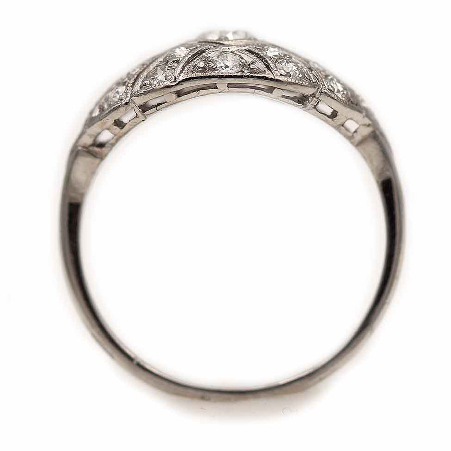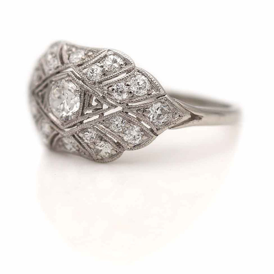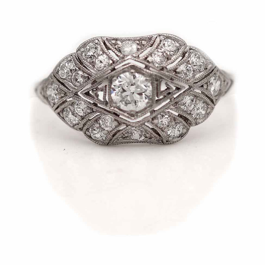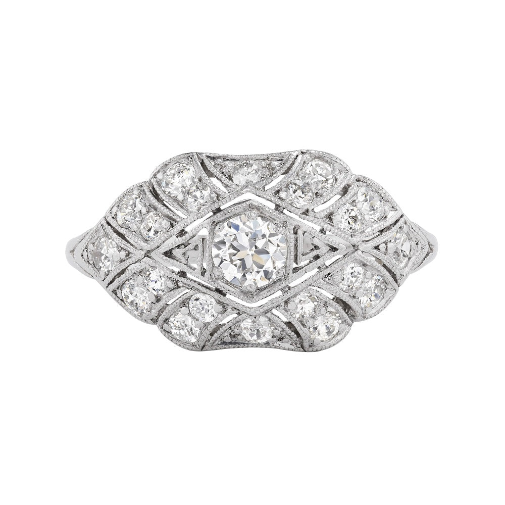 The Goldpiroul ring is an authentic vintage engagement ring from the Edwardian era, circa 1920s. The ring features a .35 carat old European cut diamond of F color and VS2 clarity, residing within a geometric square frame, surrounded by twenty (20) old mine cut diamond accents. Beautifully crafted in platinum, and accentuated with delicate milgrain engravings. An Edwardian jewel! In very good condition. Magnifique!
