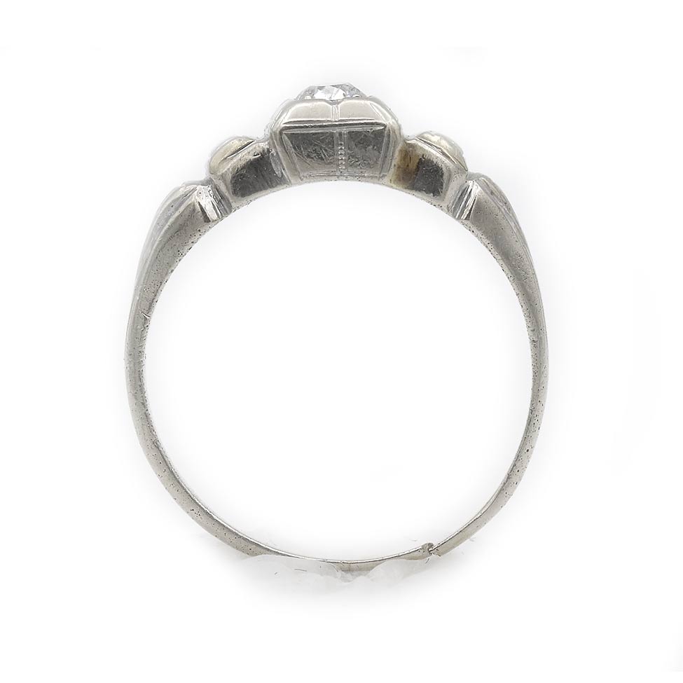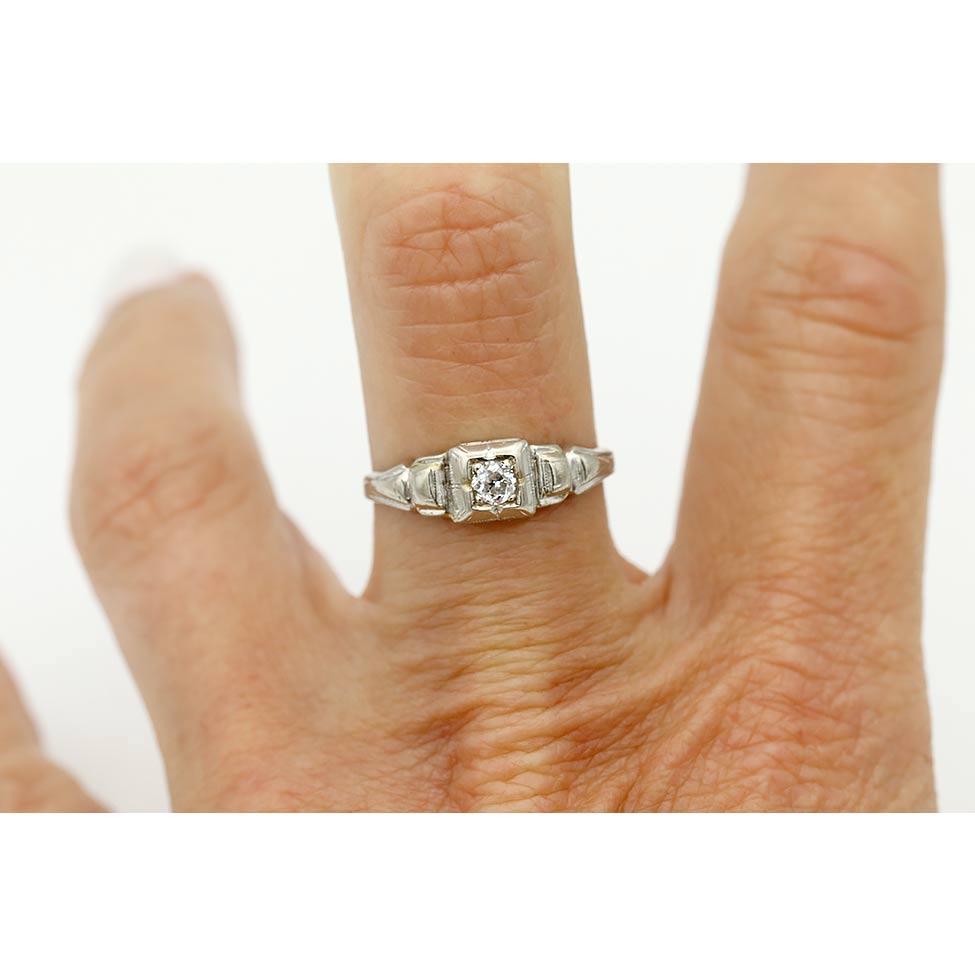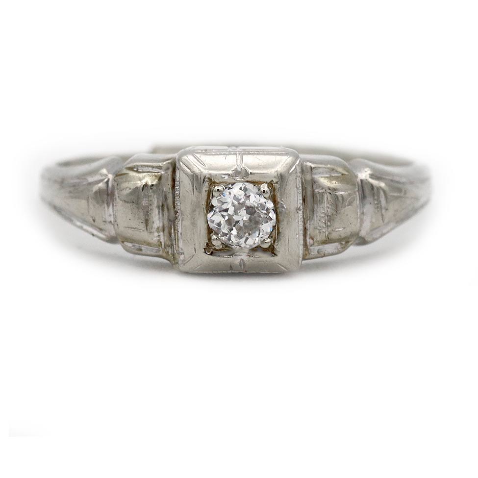 The Ambra ring is an authentic antique engagement ring circa 1920's. The ring features a .15 carat old mine cut diamond of F color, SI2 clarity, residing in a geometric square frame. Crafted in 18 karat white gold, accentuated with geometric engravings and a slightly tapered band. A classic vintage ring with the perfect amount of patina. In very good condition.
