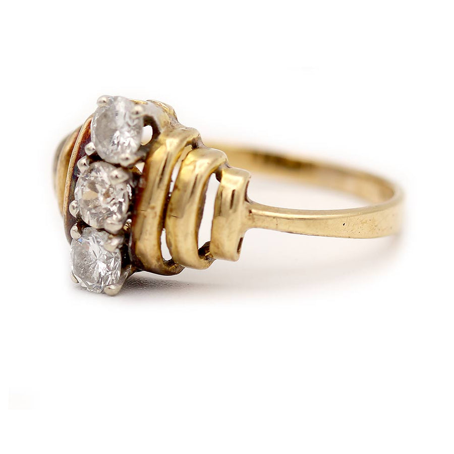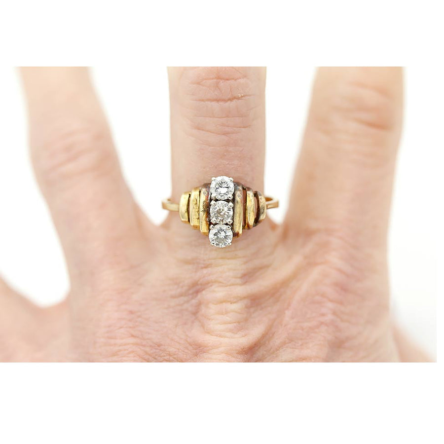 The Overton ring is an authentic vintage cocktail ring dating to the 1970s. It features three glittering mine and round cut diamonds set in a striking north–south arrangement, totaling approximately .70 carats. Beautifully crafted in 14K yellow gold, the setting displays a soft vintage patina that adds character and warmth. A bold yet wearable cocktail ring, perfect to wear on either hand and preserved in very good vintage condition.