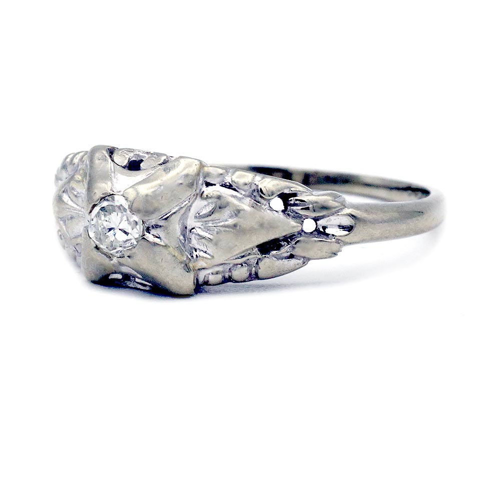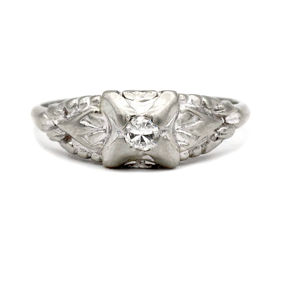 The Tori ring is an authentic vintage engagement ring from the Art Deco Era circa 1930’s. The ring showcases a .15 carat old mine cut diamond, with F color and SI1 clarity. Crafted in 18 karat white gold, completed with delicate filigree engravings. A sleek and bold vintage piece, with unique filigree engravings. In very good condition.