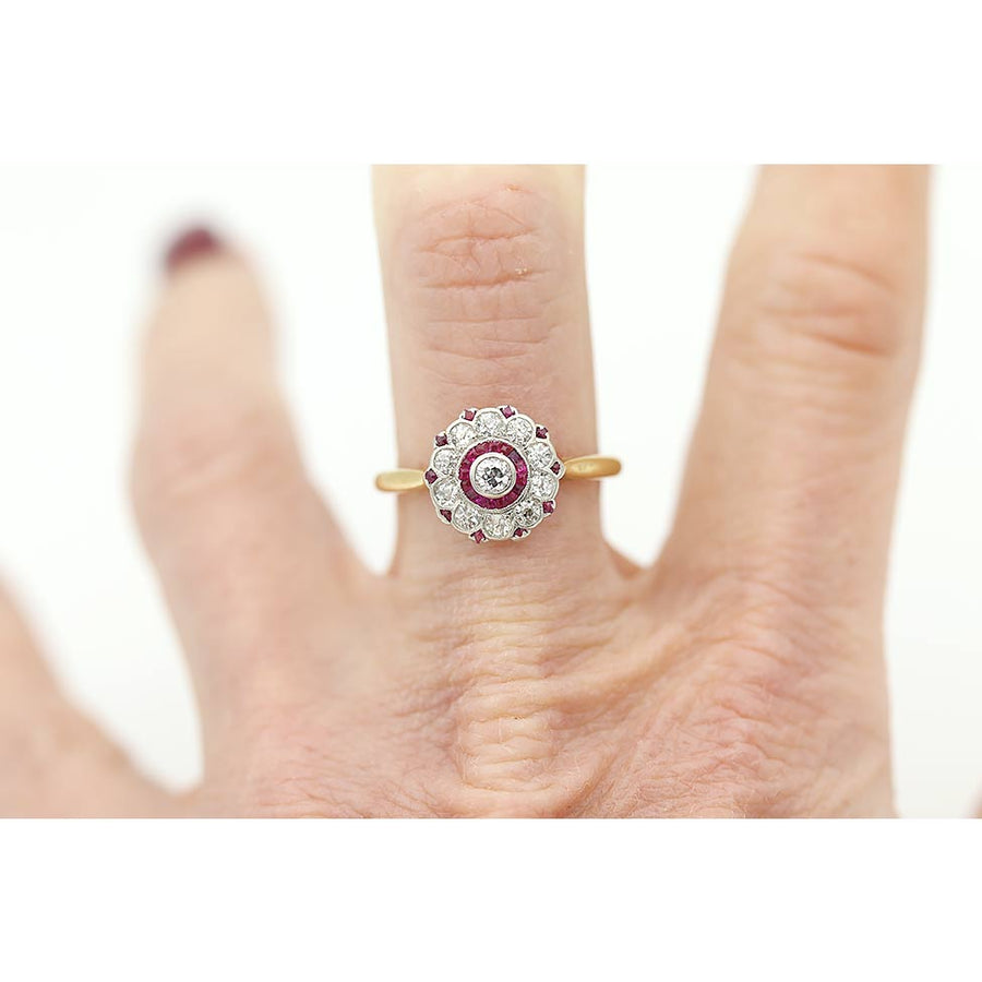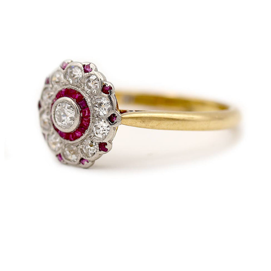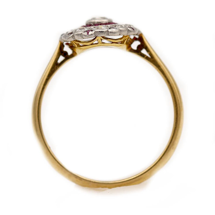 The Whisper ring is an authentic Victorian-era engagement ring dating to the early 1900s. At its center is a bright white .40 carat old mine cut diamond, framed by a delicate halo of ten old mine cut diamond accents and twenty-six natural Burma rubies in square and round cuts. Crafted in platinum and 18 kt yellow gold, this striking halo ring reflects the intricate craftsmanship and rich color contrasts characteristic of the Victorian era. A truly special antique piece, offered in good condition.