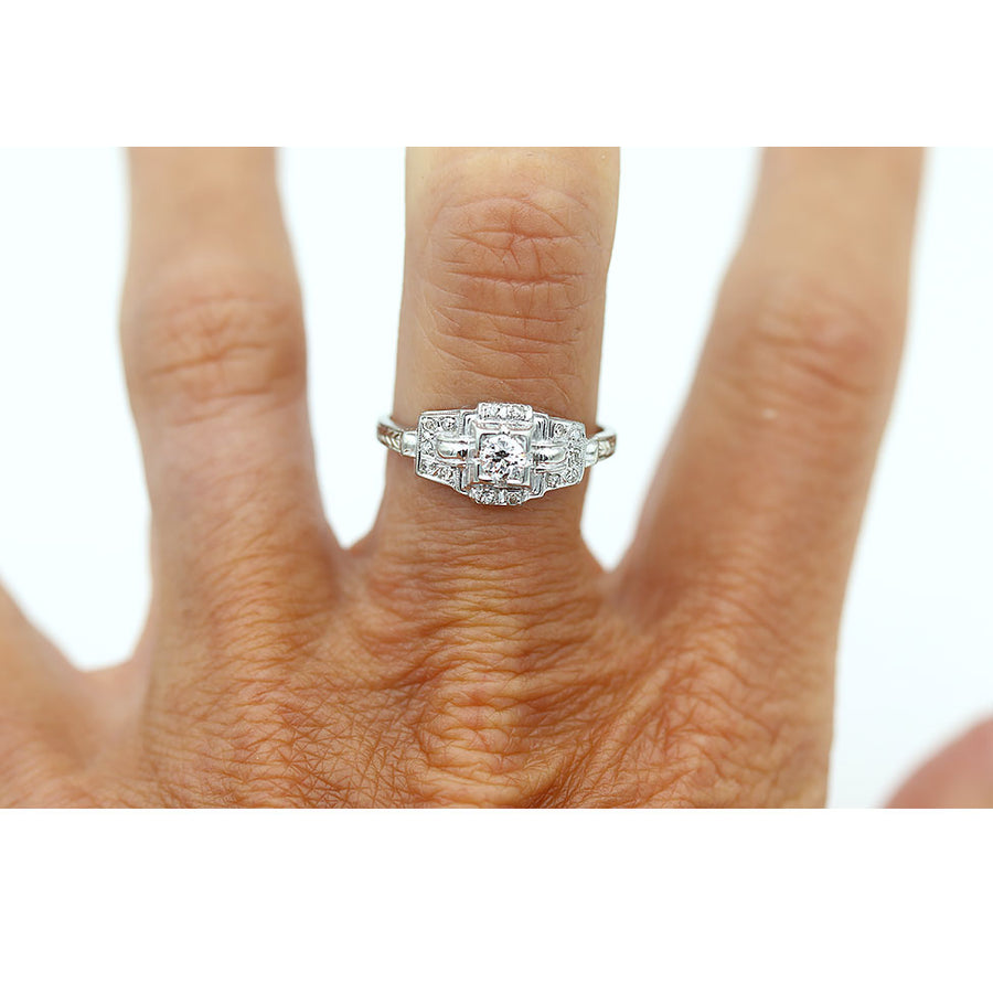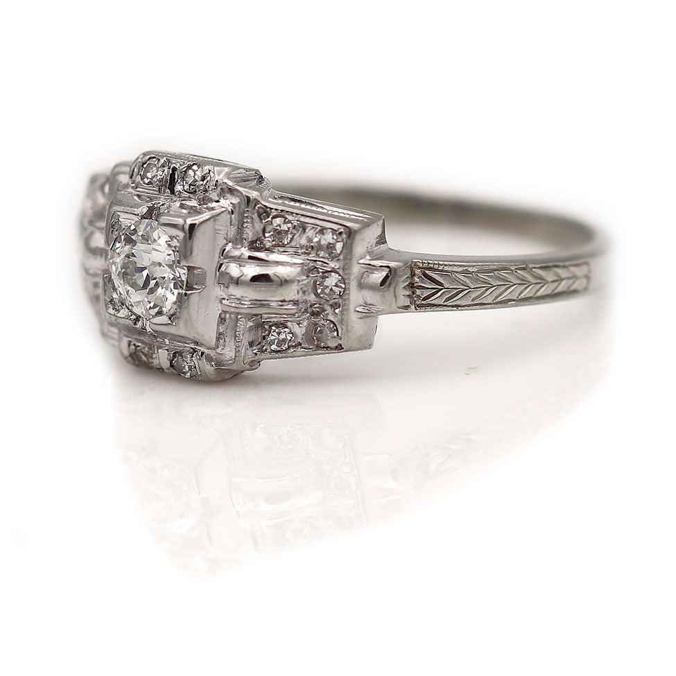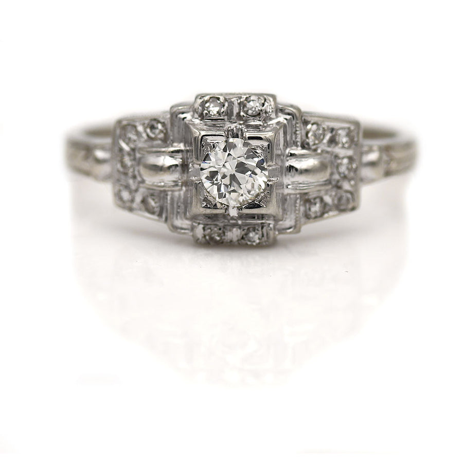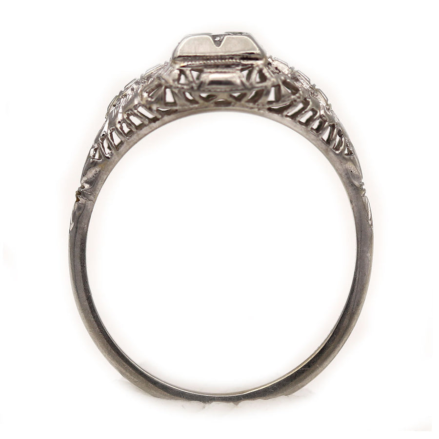 The Buena ring is an authentic vintage engagement ring, circa 1930s. This ring showcases a .20 carat old mine cut diamond with F color and VS2 clarity, residing in a geometric square frame, surrounded by fourteen (14) single cut diamond accents. Beautifully crafted in 14 kt white gold, and accentuated with filigree engravings, this is a classic Art Deco piece. In very good condition.