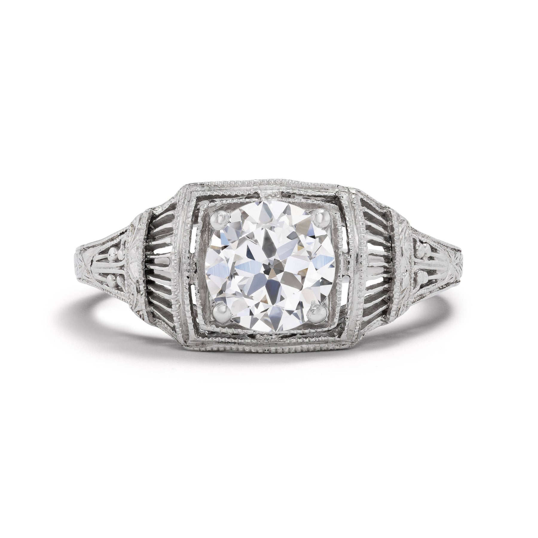 The Yamish ring is an authentic vintage diamond engagement ring from the Art Deco era circa 1920's. This intricate filigree diamond engagement ring features a GI A certified 1.00 old European cut diamond of E color, VS1 clarity, residing in a two tiered geometric milgrain frame. Beautifully crafted in platinum, accentuated with swirls of open metal work and and intricate filigree engravings. A rare, timeless jewel! In excellent condition.