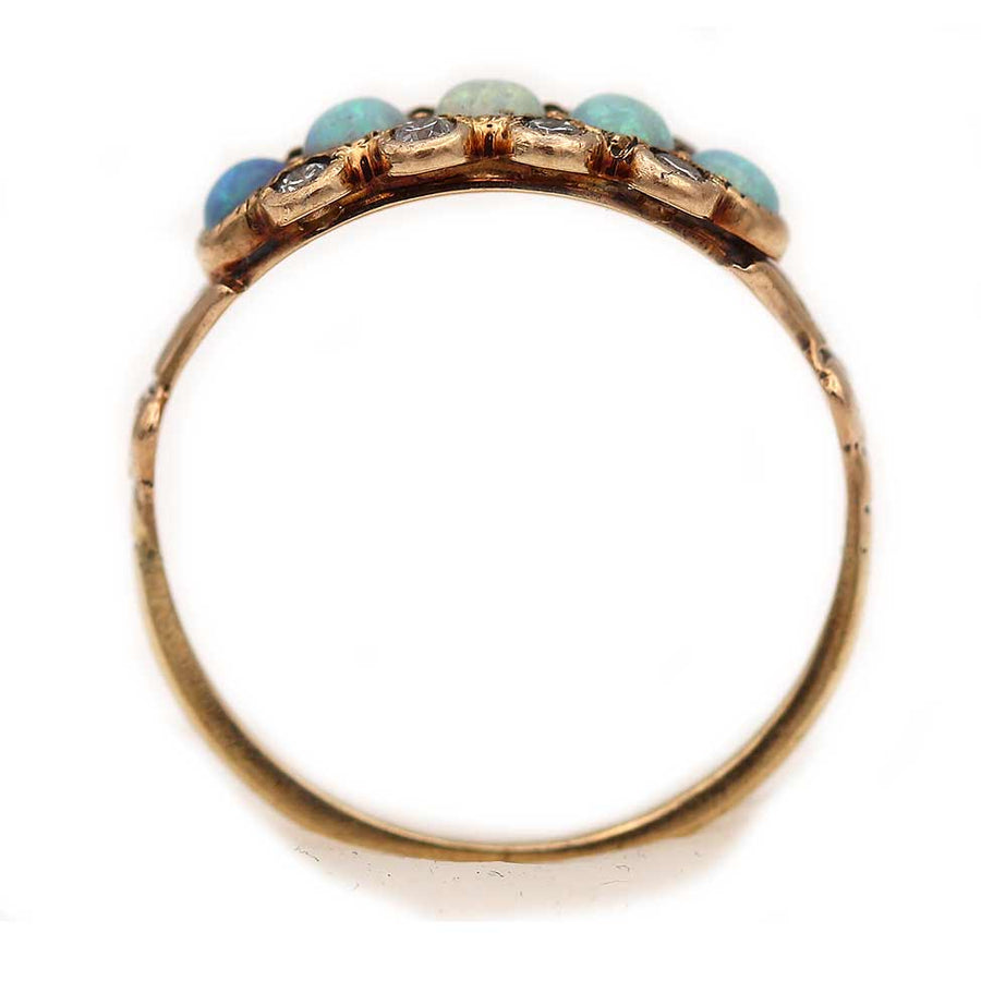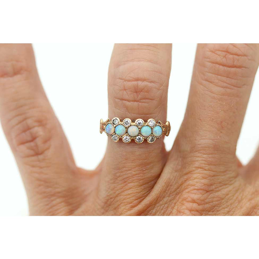 The Harkness band is an authentic vintage wedding ring from the Victorian era, circa 1900s. This ring features five (5) natural cabochon opals surrounded by eight (8) bezel set old mine cut diamonds. Beautifully crafted in 10 kt rosy-yellow gold, and accentuated with delicate filigree engravings. A perfect ring to stack. As lovely as can be, in very good condition.