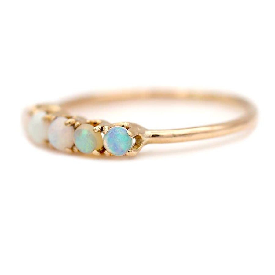 The Fitzie band is an authentic Victorian opal wedding band dating to the early 1900s. This dainty band features five natural opals set across a warm 10 karat rosy-yellow gold band. Sweet and understated, it’s perfect for stacking or wearing on its own. In very good antique condition.