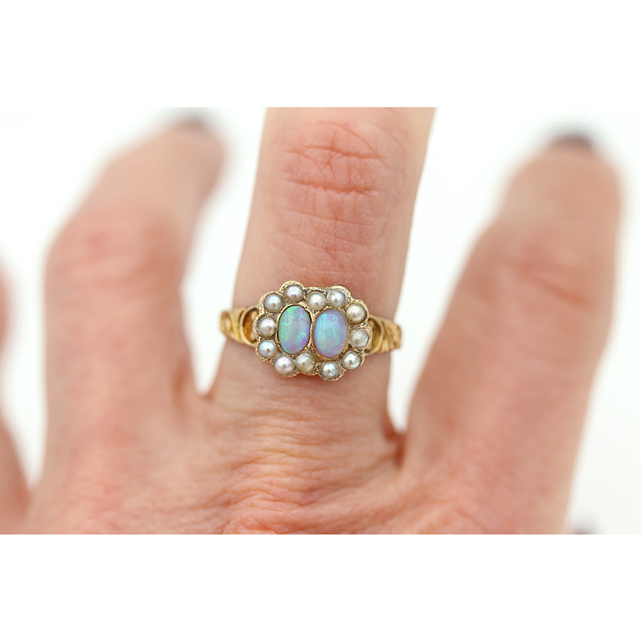 The Jonsey ring is an authentic vintage wedding ring from the Victorian era, circa 1900's. This delicate gemstone ring features two (2) natural cabochon opals, weighing 1.00 ctw, surrounded by twelve vintage seed pearls. Beautifully crafted in 10 kt rosy-yellow gold, this is a sweet, elegant Victorian gemstone ring, perfect to wear on either hand. In very good condition.