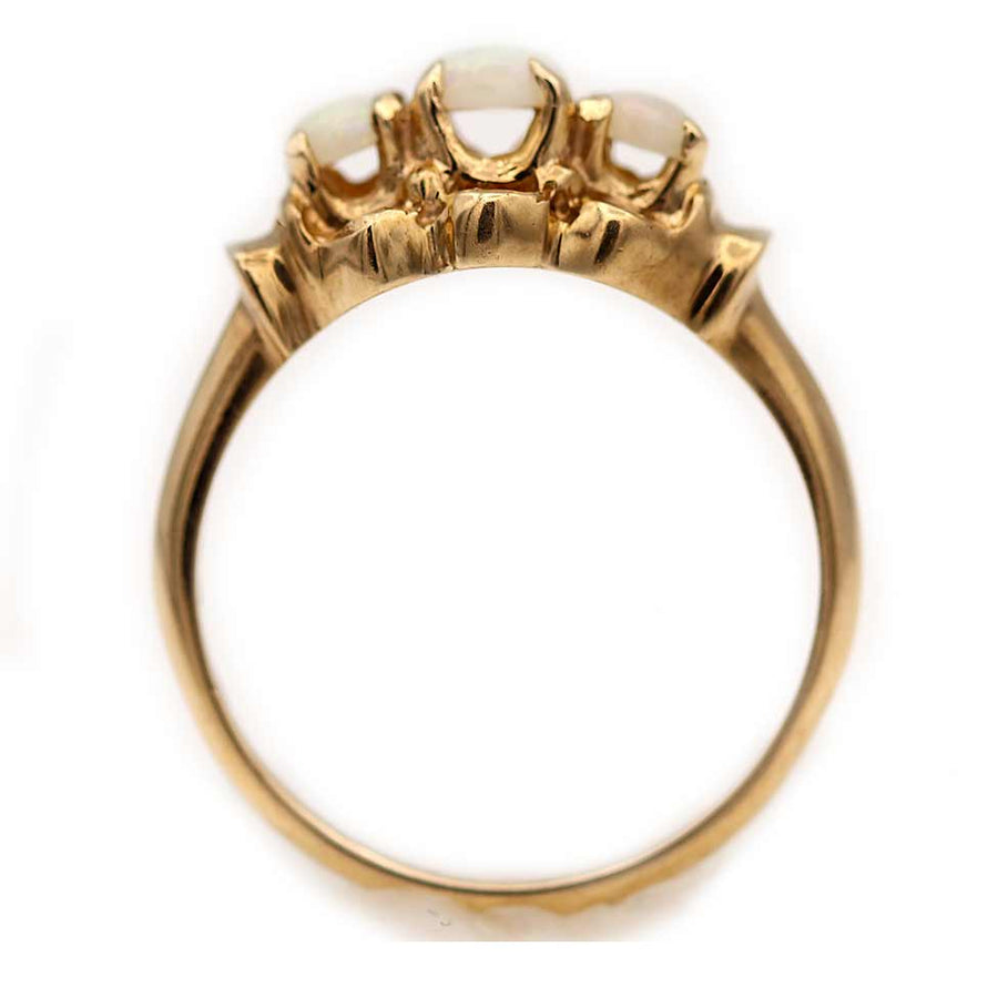 The Monaco ring is an authentic Victorian three stone engagement ring, circa 1900's, featuring three (3) natural, cabochon opals weighing approximately 1.00 carat. Beautifully crafted in 10 kt yellow gold, and accentuated with open metal work, this ring is as sweet as can be. In very good condition.