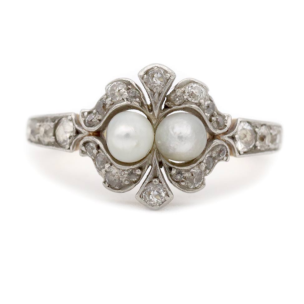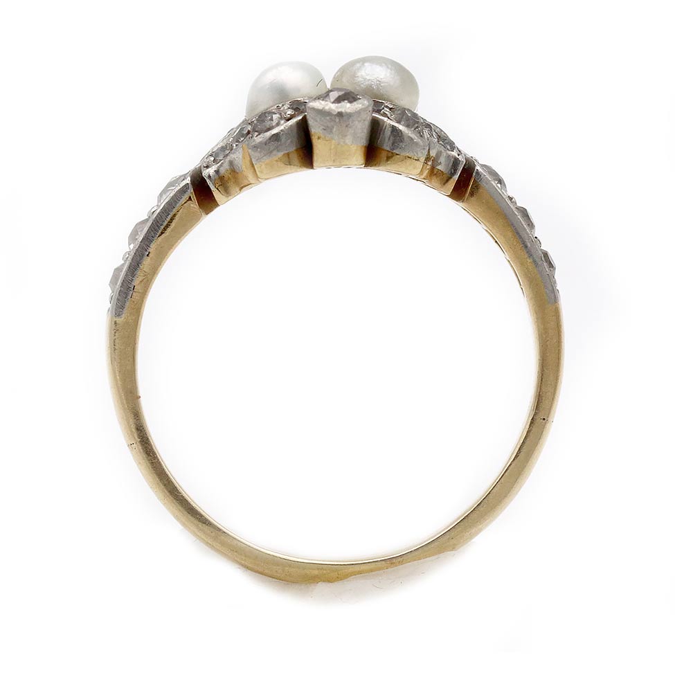The Vanda ring is an authentic Victorian Toi et Moi engagement ring circa 1900s. This ring features two (2) natural vintage pearls surrounded by sixteen (16) old mine cut diamond accents. Beautifully hand-crafted in platinum and 10 kt yellow gold, this is a lovely Victorian piece perfect to wear on either hand. They don't come any finer, in very good condition. Size 7.5.