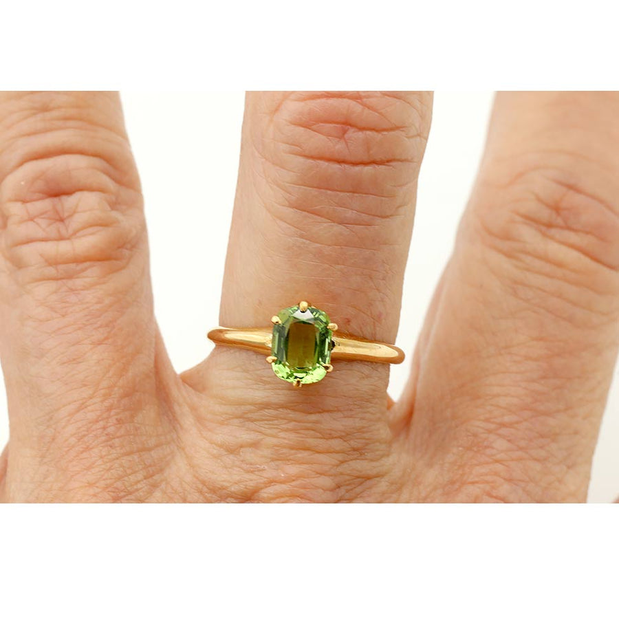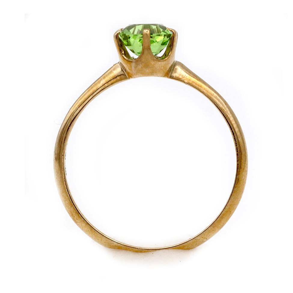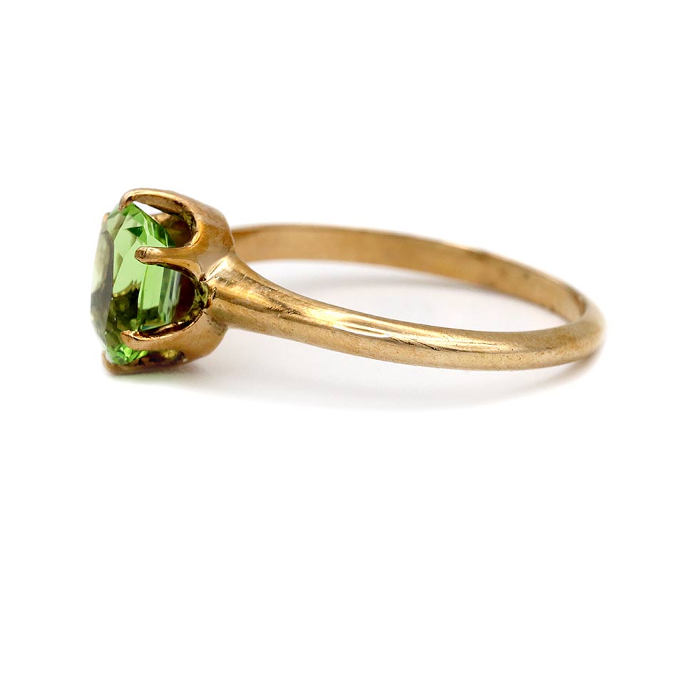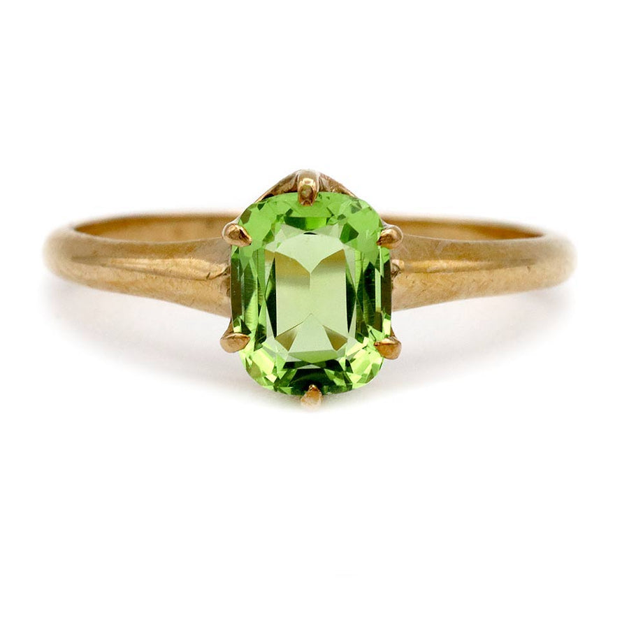 The Illych ring is an authentic Victorian peridot solitaire engagement ring circa 1900s. This original ring features a natural 1.01 carat antique cushion-cut peridot in a deep green hue, secured in a classic six-prong setting. Handcrafted in 10 karat rosy-yellow gold this is a delicate and beautifully preserved Victorian gemstone ring.