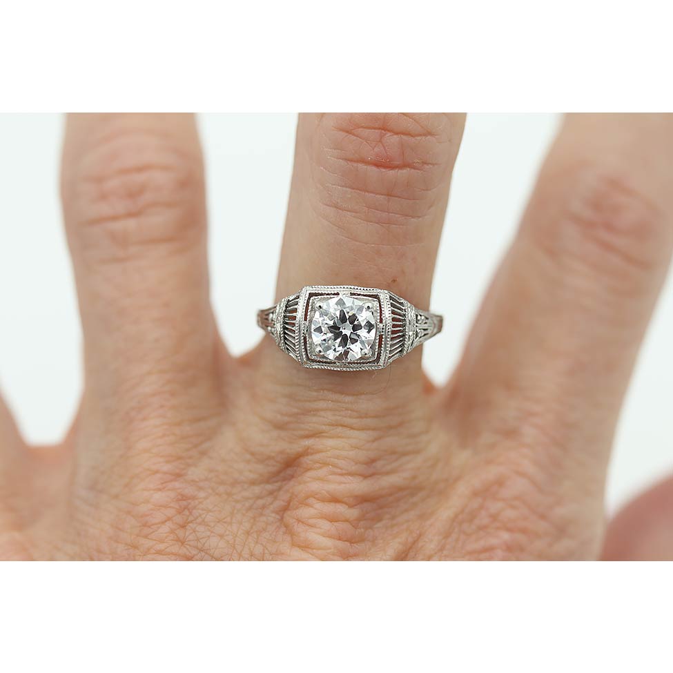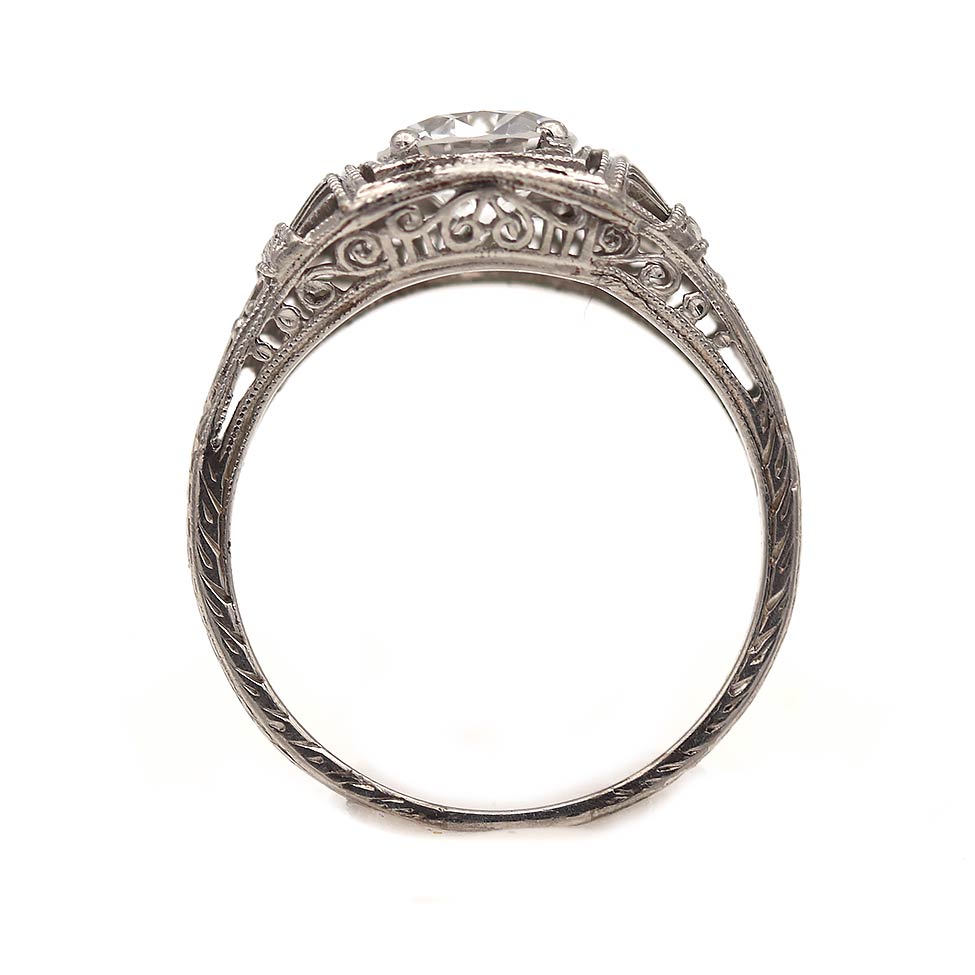 The Yamish ring is an authentic vintage diamond engagement ring from the Art Deco era circa 1920's. This intricate filigree diamond engagement ring features a GI A certified 1.00 old European cut diamond of E color, VS1 clarity, residing in a two tiered geometric milgrain frame. Beautifully crafted in platinum, accentuated with swirls of open metal work and and intricate filigree engravings. A rare, timeless jewel! In excellent condition.