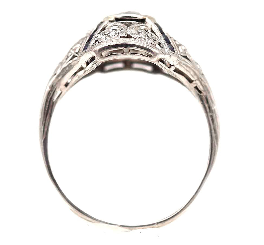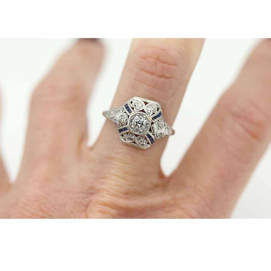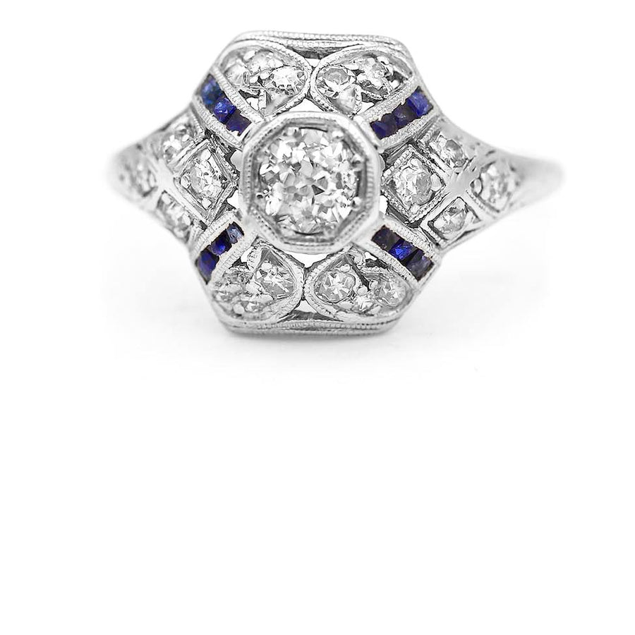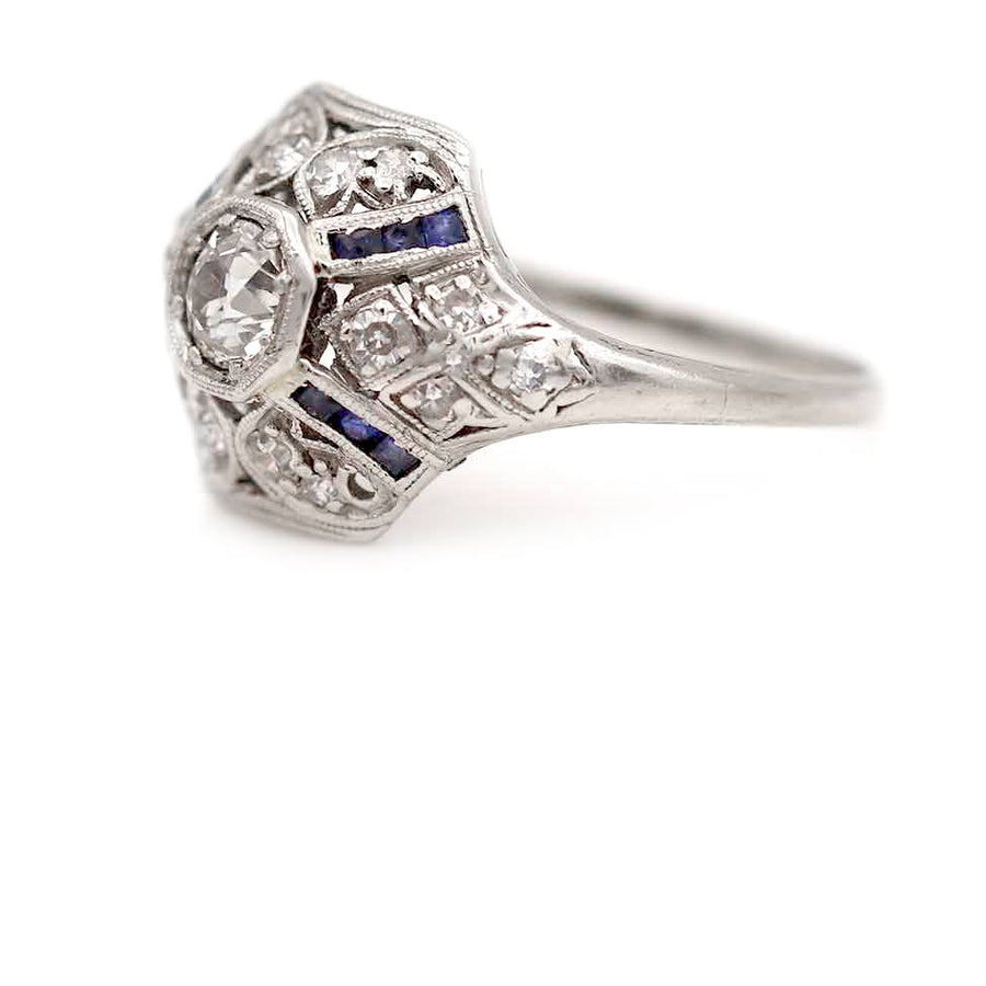The Forrest ring is an authentic antique engagement ring from the Art Deco era, circa 1930s. This Art Deco diamond and sapphire engagement ring boasts a .30 carat old mine cut diamond of H color and VS2 clarity, residing within a geometric octagonal frame. The diamond is flanked by 12 vintage synthetic square cut sapphires and sixteen (16) single cut diamond accents. Beautifully crafted in platinum, accentuated with open metal work and milgrain engravings. Rare, timeless and in good condition.