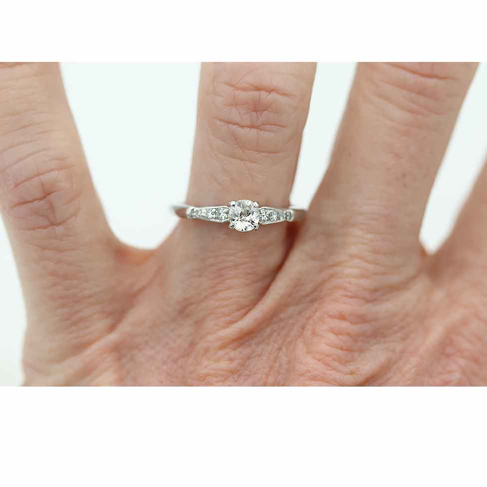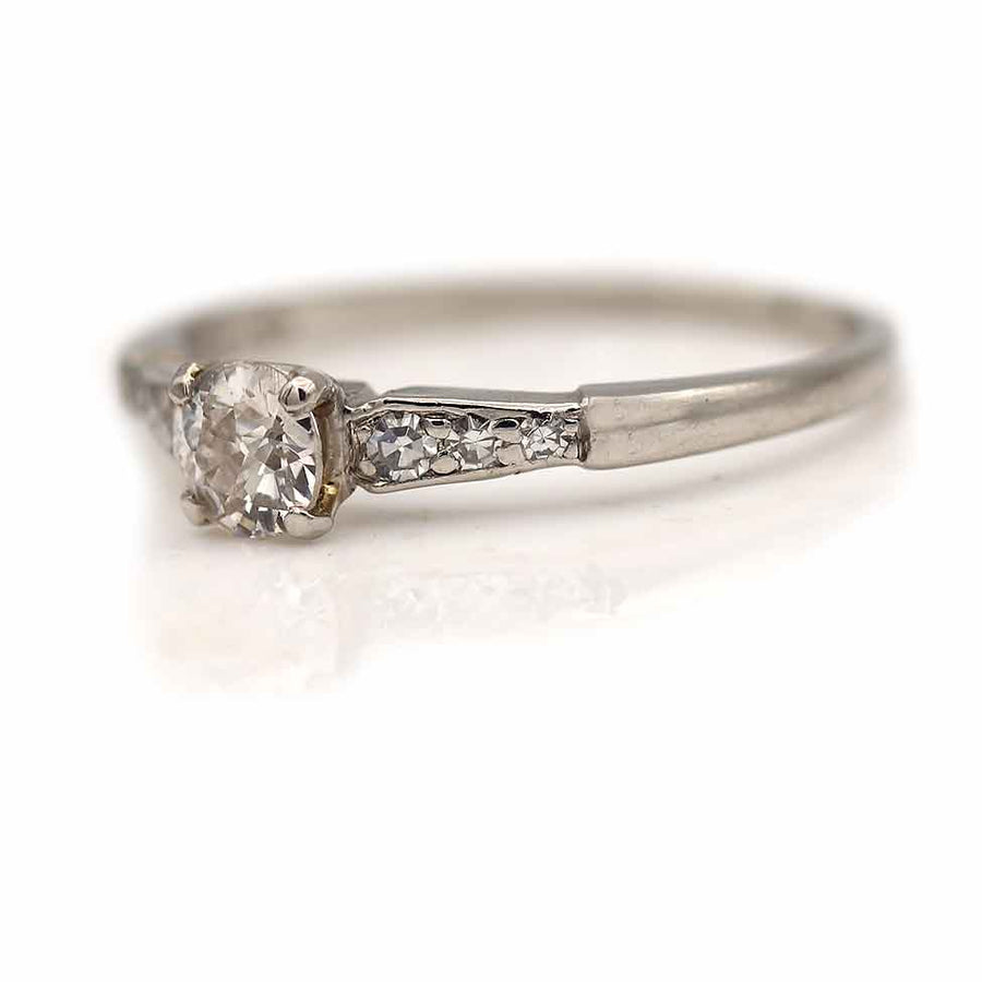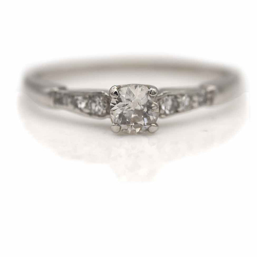 The Caravan ring is an authentic vintage engagement ring, circa 1940s. This ring features a .30 carat old mine cut diamond with J color and VS2 clarity, flanked by six (6) single cut diamond accents. Beautifully crafted in platinum. In very good condition.