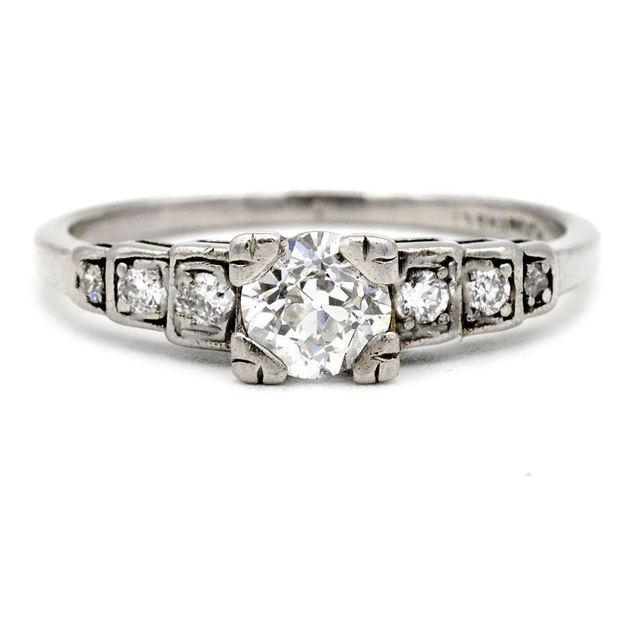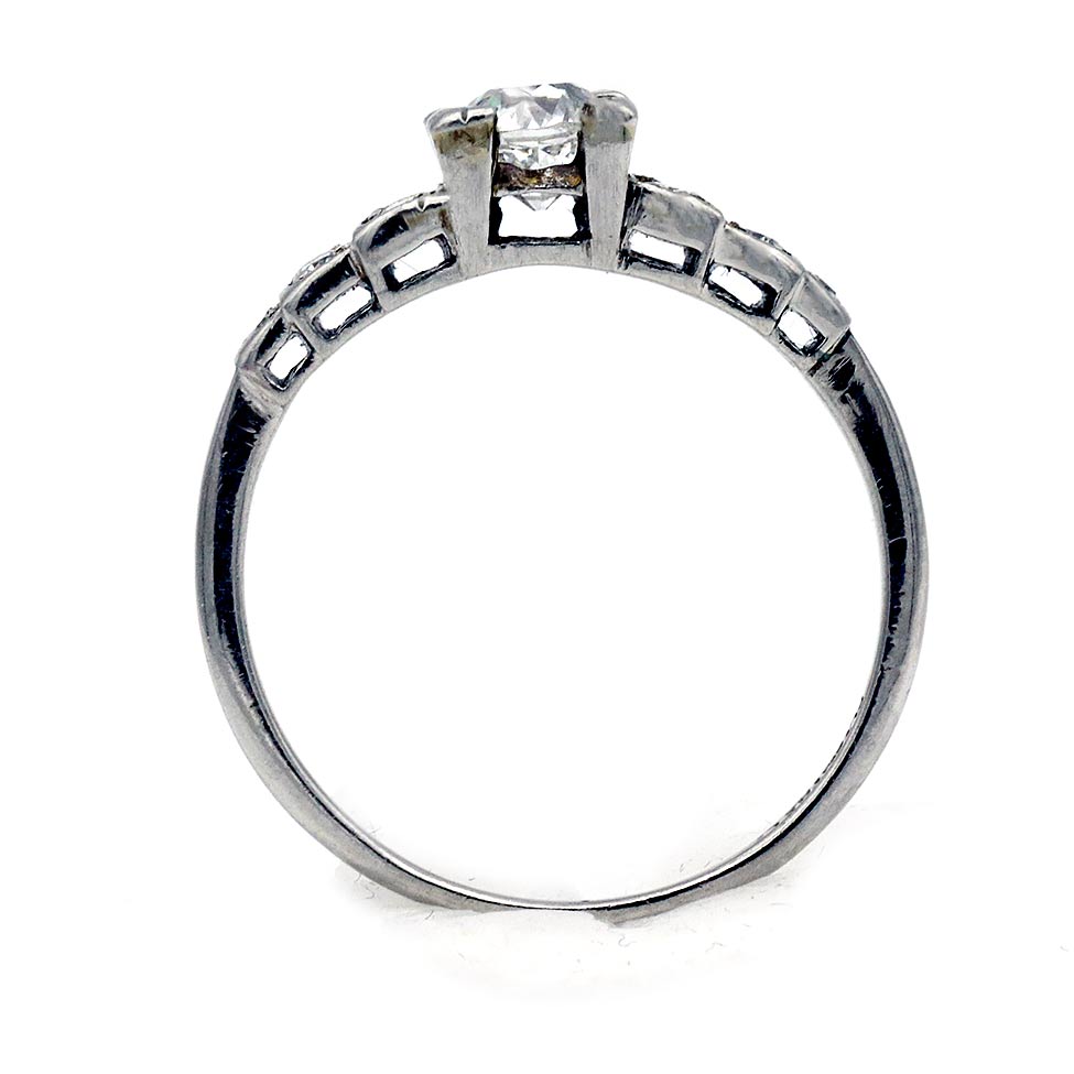 The Jill ring is an authentic antique engagement ring from the Art Deco era circa 1930s. The ring features a classic .45 carat old European cut diamond of H color, VS2 clarity, set within trefoil prongs. The diamond is flanked by 6 side tiered old European and single cut diamond accents. Crafted in gleaming platinum. A sleek, beautiful antique piece. Perfect to stack with any vintage band. In very good condition.
