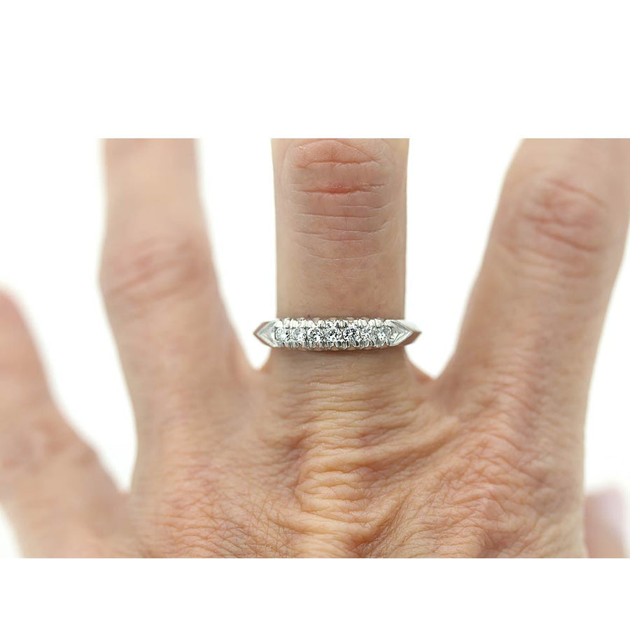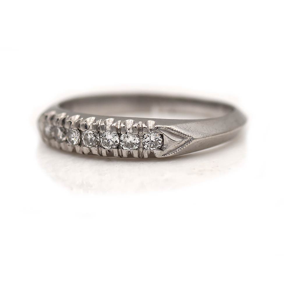 Manon is a stunning antique wedding band featuring 7 bright-white, prong set, old European cut diamonds, weighing .25 carat (F color and SI1 clarity). Beautifully crafted in platinum, during the 1950's, this is the perfect band to stack with other vintage wedding bands or to compliment your vintage engagement ring. In very good condition. The band measures 4.0 wide tapering to 3.25 and .08 at the bottom.